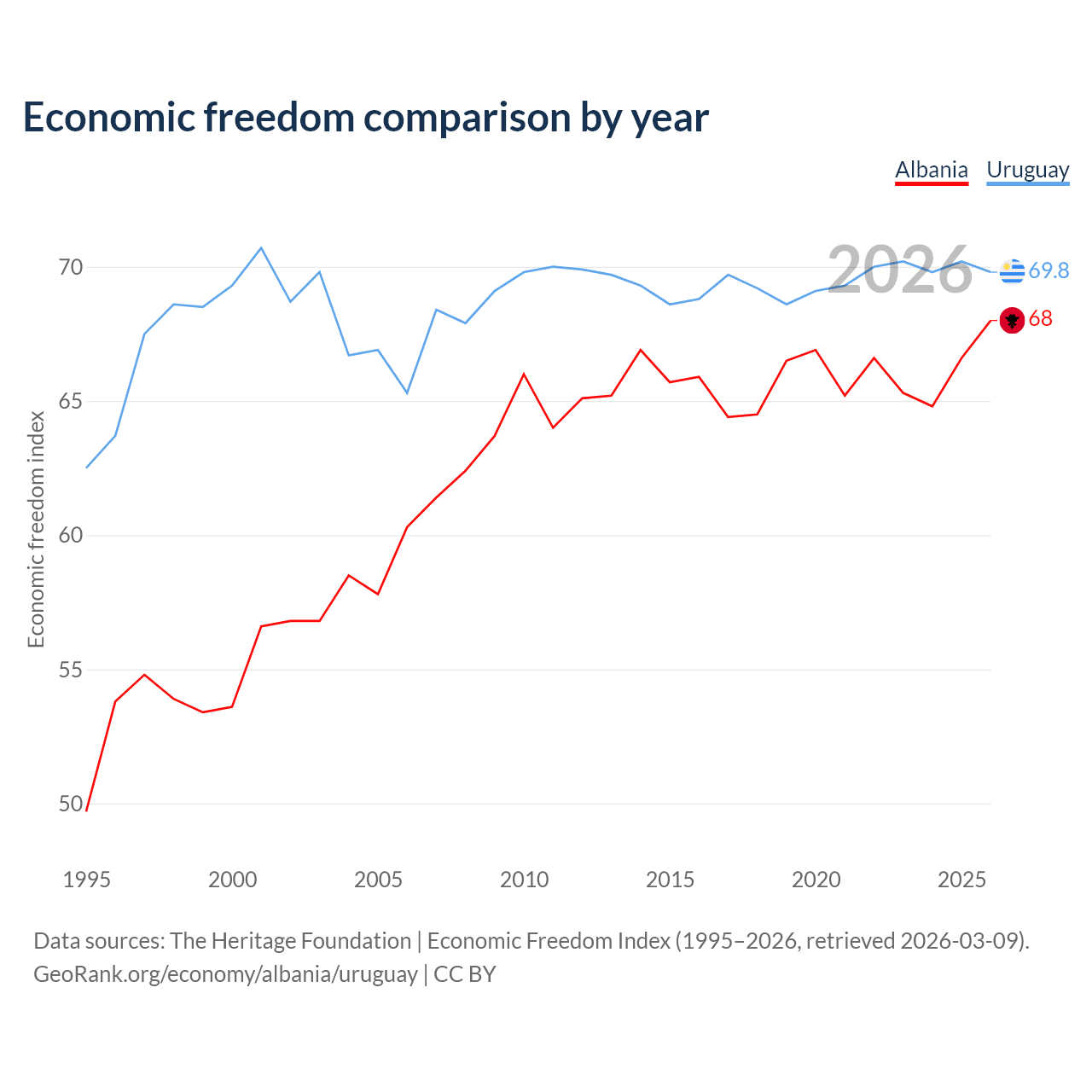 The Economic Freedom Index for Albania is 68, ranking 50/197, compared to 69.8 for Uruguay, ranking 39/197. The chart above displays a comparison of annual changes in economic freedom indexes.