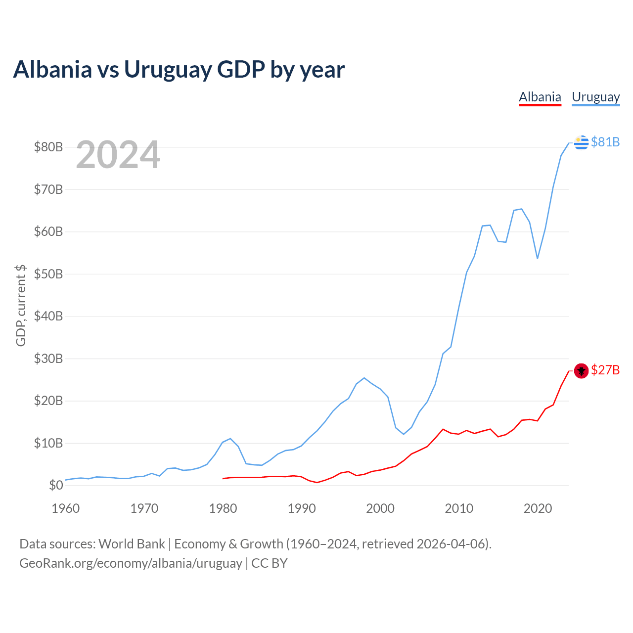 Albania has a GDP of $27B compared to $81B for Uruguay, ranking 112/197 and 81/197 by economy size, respectively.