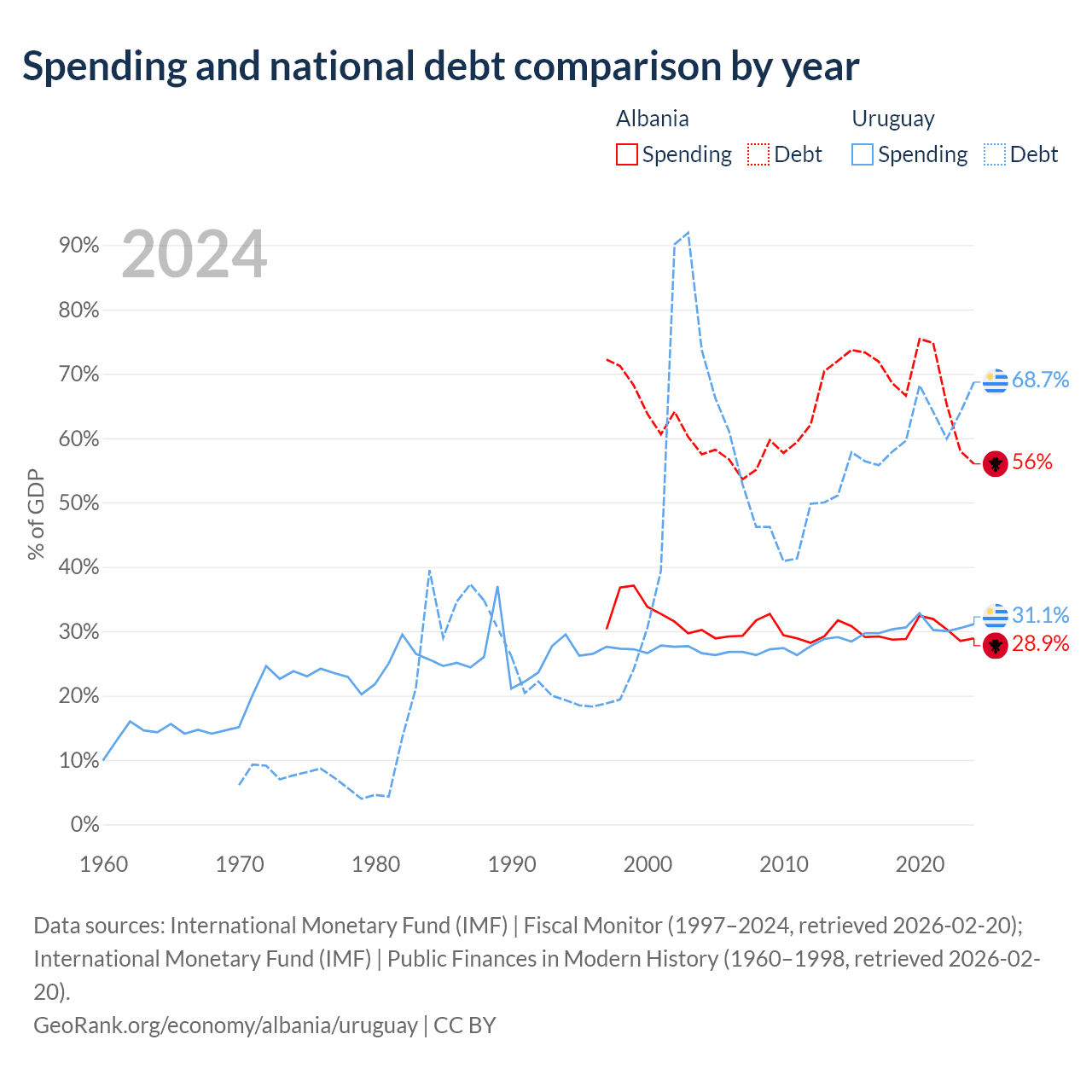 Albania has $15.2B in government debt (56% of GDP), compared to $55.6B (68.7% of GDP) in Uruguay.
