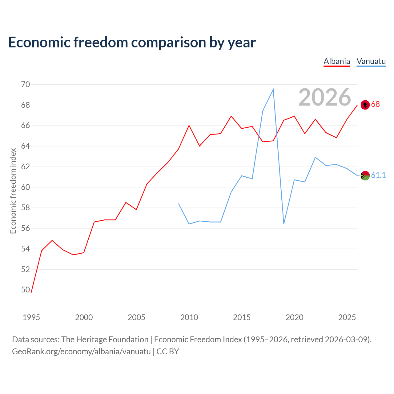 The Economic Freedom Index for Albania is 68, ranking 50/197, compared to 61.1 for Vanuatu, ranking 92/197. The chart above displays a comparison of annual changes in economic freedom indexes.