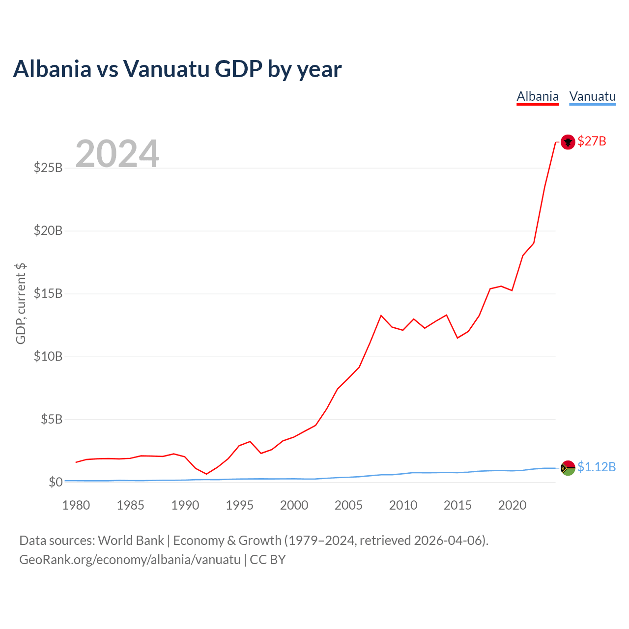Albania has a GDP of $27B compared to $1.12B for Vanuatu, ranking 112/197 and 188/197 by economy size, respectively.