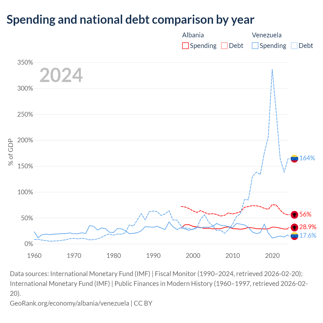 Albania has $15.2B in government debt (56% of GDP), compared to $197B (164.3% of GDP) in Venezuela.
