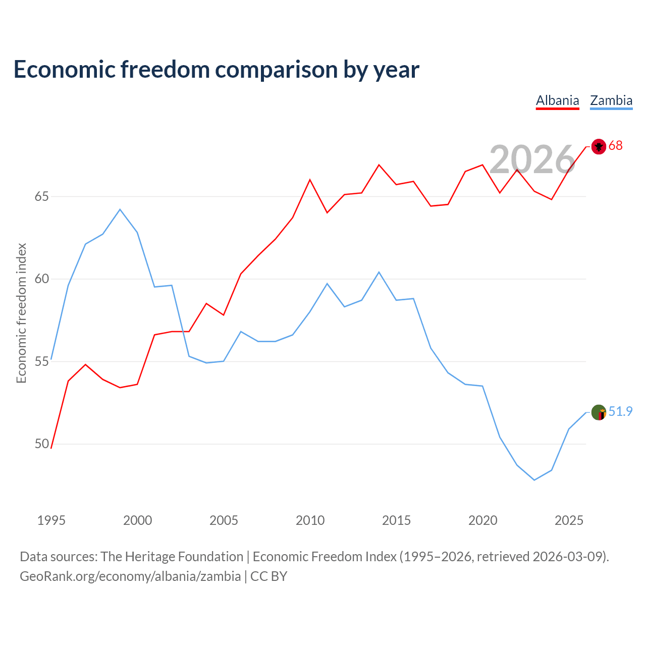 The Economic Freedom Index for Albania is 68, ranking 50/197, compared to 51.9 for Zambia, ranking 152/197. The chart above displays a comparison of annual changes in economic freedom indexes.