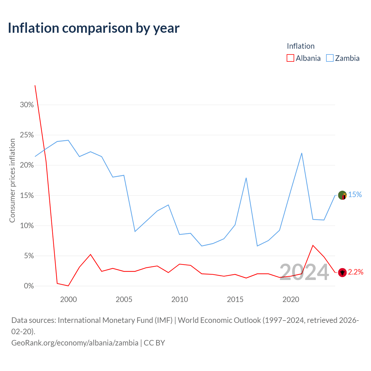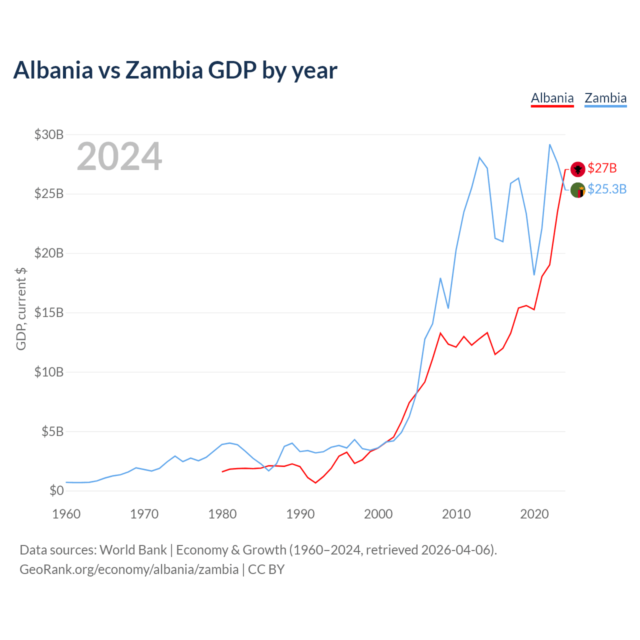 Albania has a GDP of $27B compared to $25.3B for Zambia, ranking 112/197 and 116/197 by economy size, respectively.