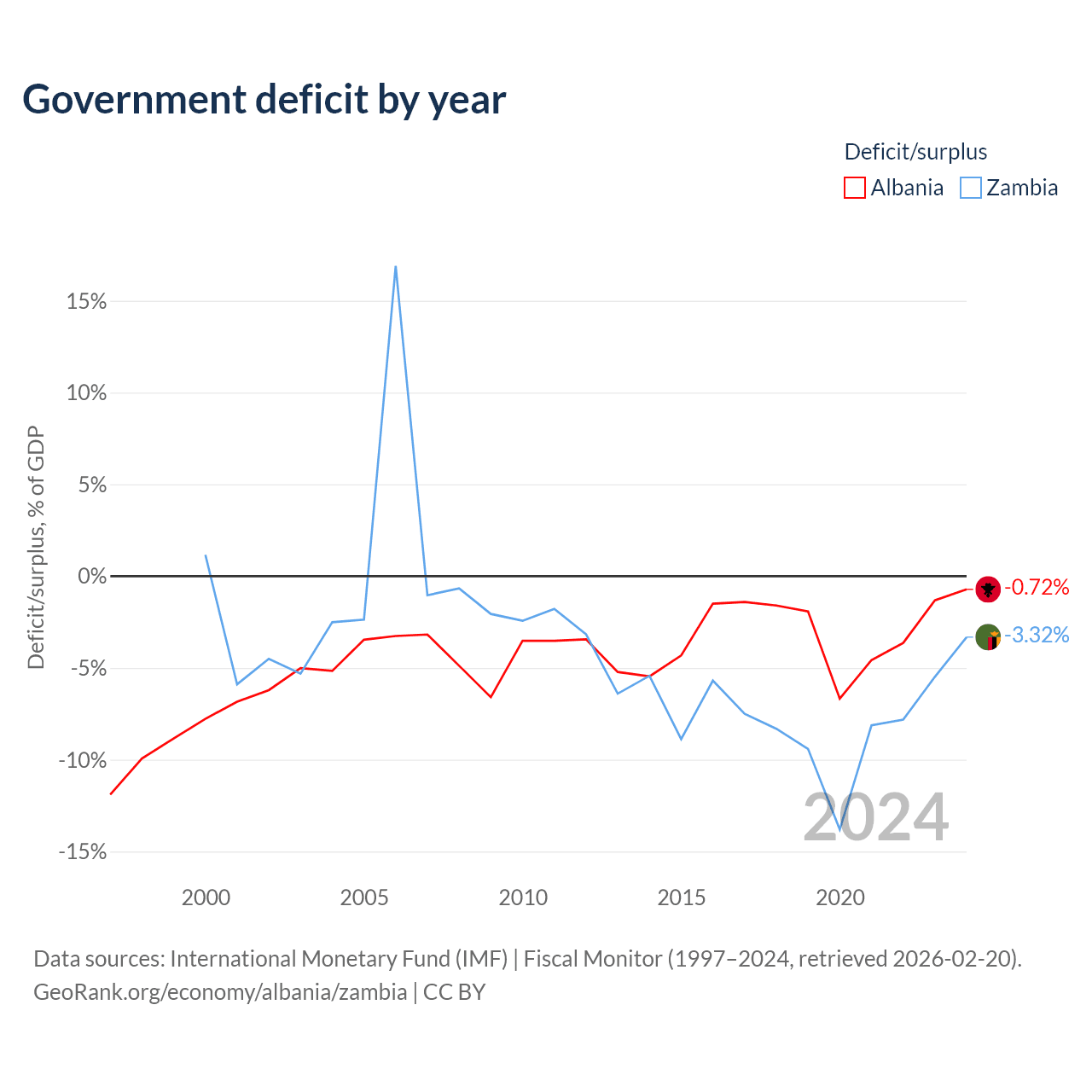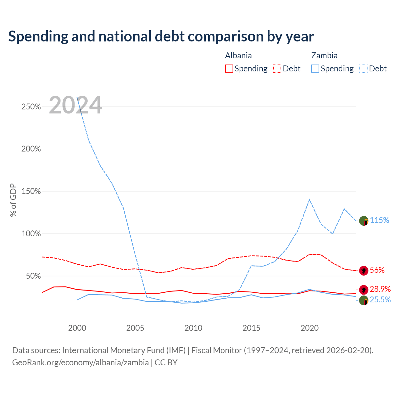 Albania has $15.2B in government debt (56% of GDP), compared to $29.1B (114.9% of GDP) in Zambia.