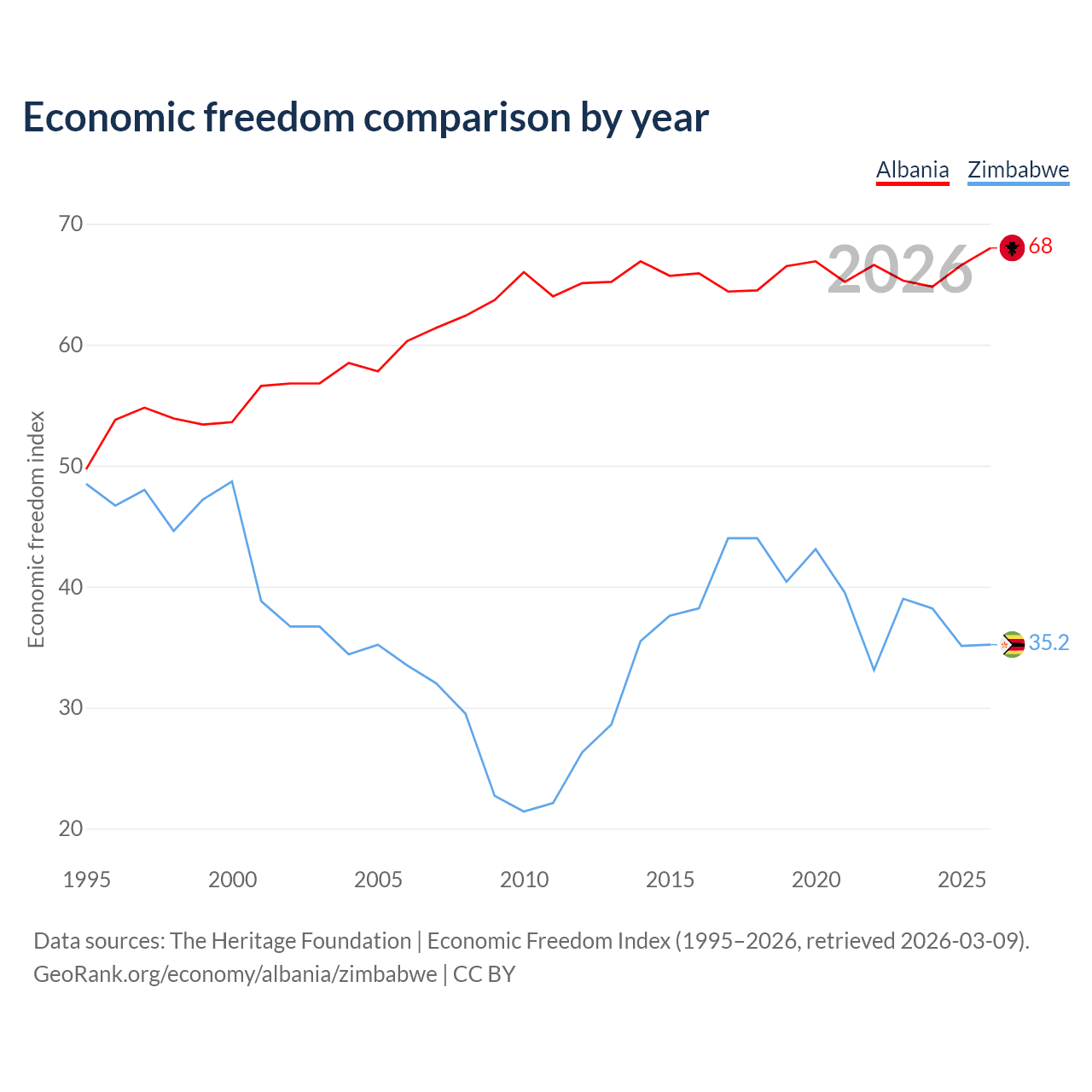 The Economic Freedom Index for Albania is 68, ranking 50/197, compared to 35.2 for Zimbabwe, ranking 190/197. The chart above displays a comparison of annual changes in economic freedom indexes.