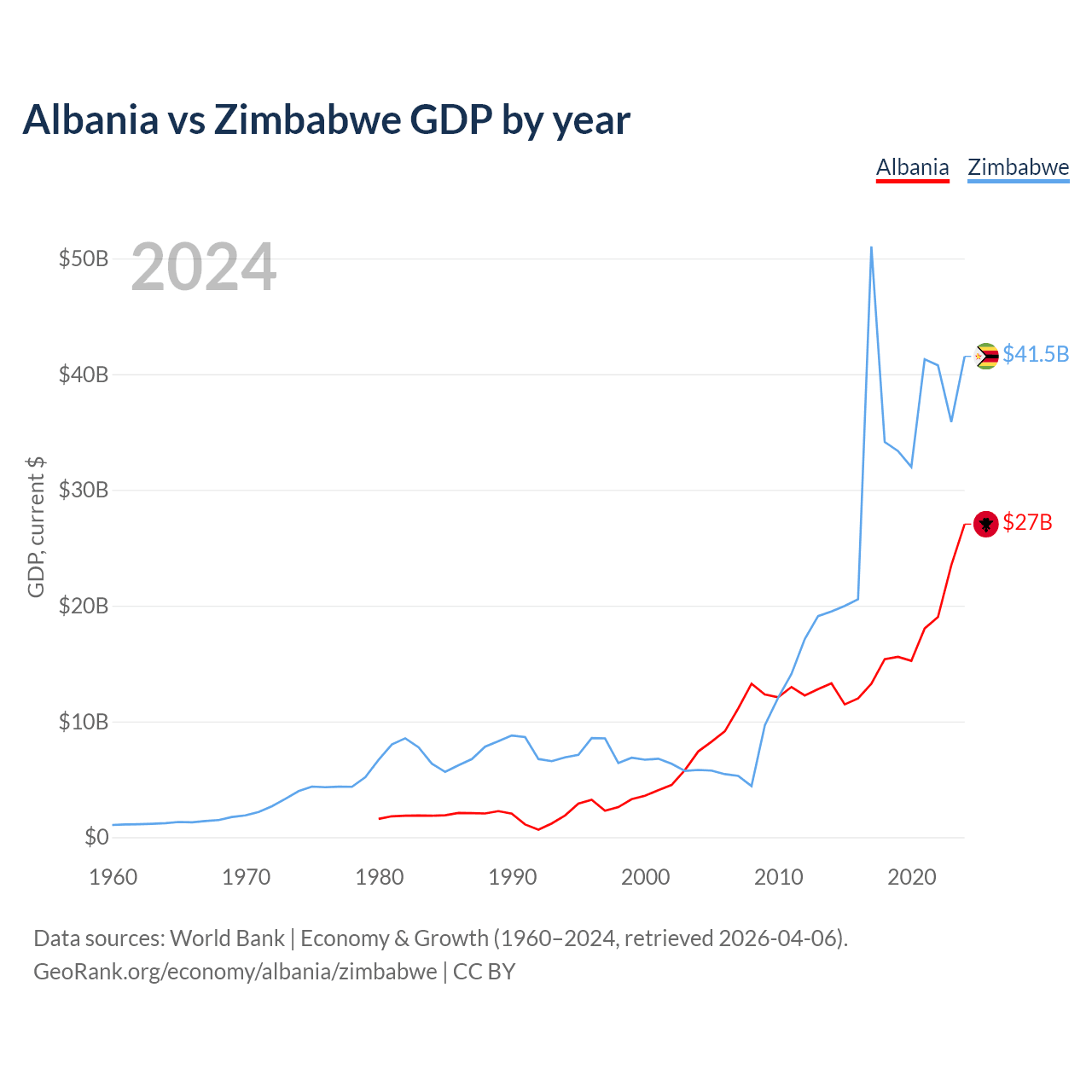 Albania has a GDP of $27B compared to $41.5B for Zimbabwe, ranking 112/197 and 102/197 by economy size, respectively.