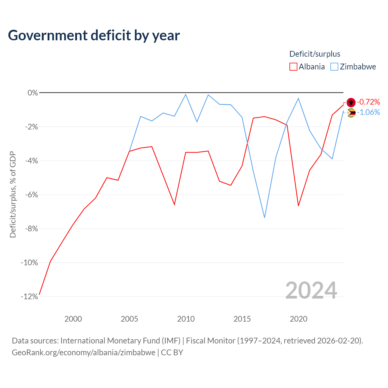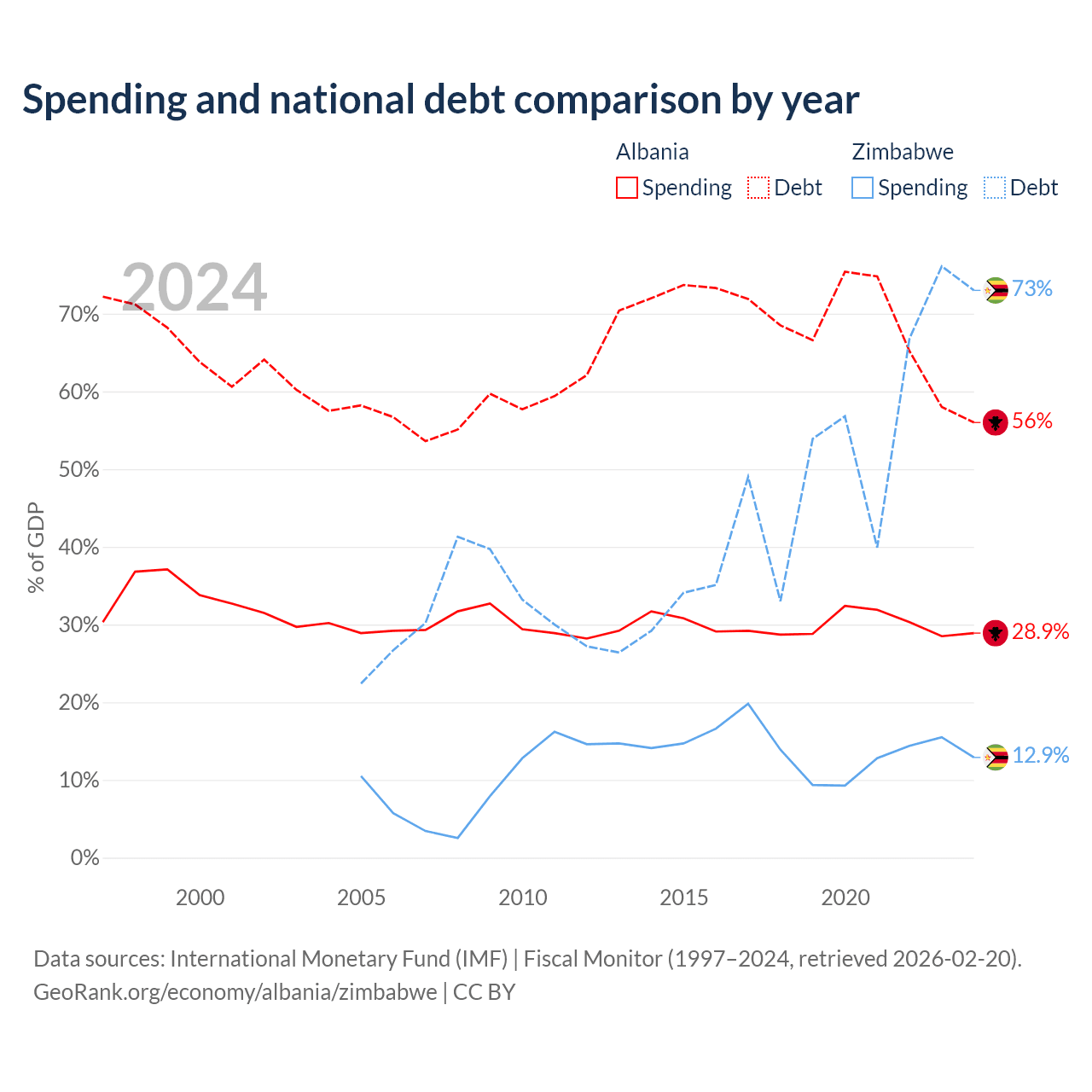 Albania has $15.2B in government debt (56% of GDP), compared to $30.3B (73% of GDP) in Zimbabwe.