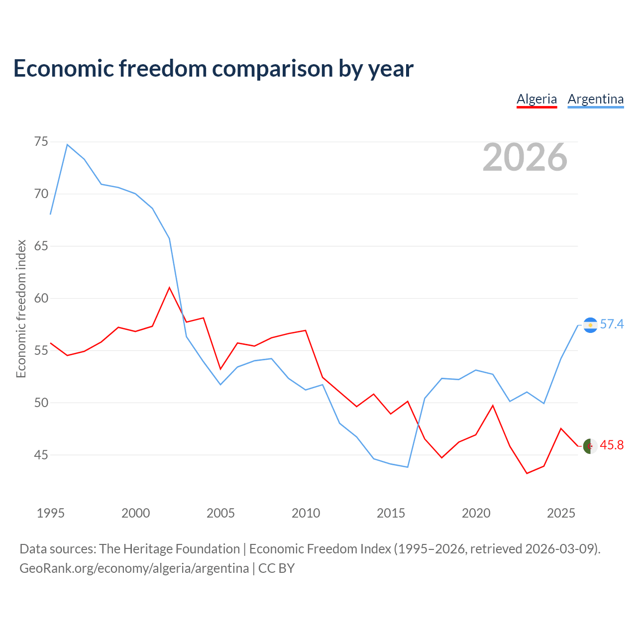The Economic Freedom Index for Algeria is 45.8, ranking 179/197, compared to 57.4 for Argentina, ranking 117/197. The chart above displays a comparison of annual changes in economic freedom indexes.
