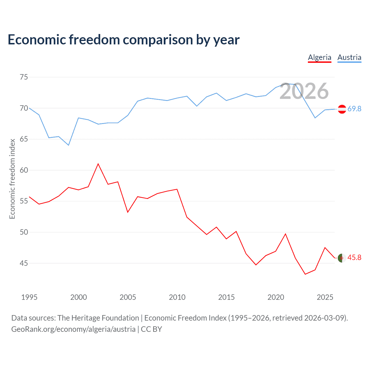 The Economic Freedom Index for Algeria is 45.8, ranking 179/197, compared to 69.8 for Austria, ranking 38/197. The chart above displays a comparison of annual changes in economic freedom indexes.