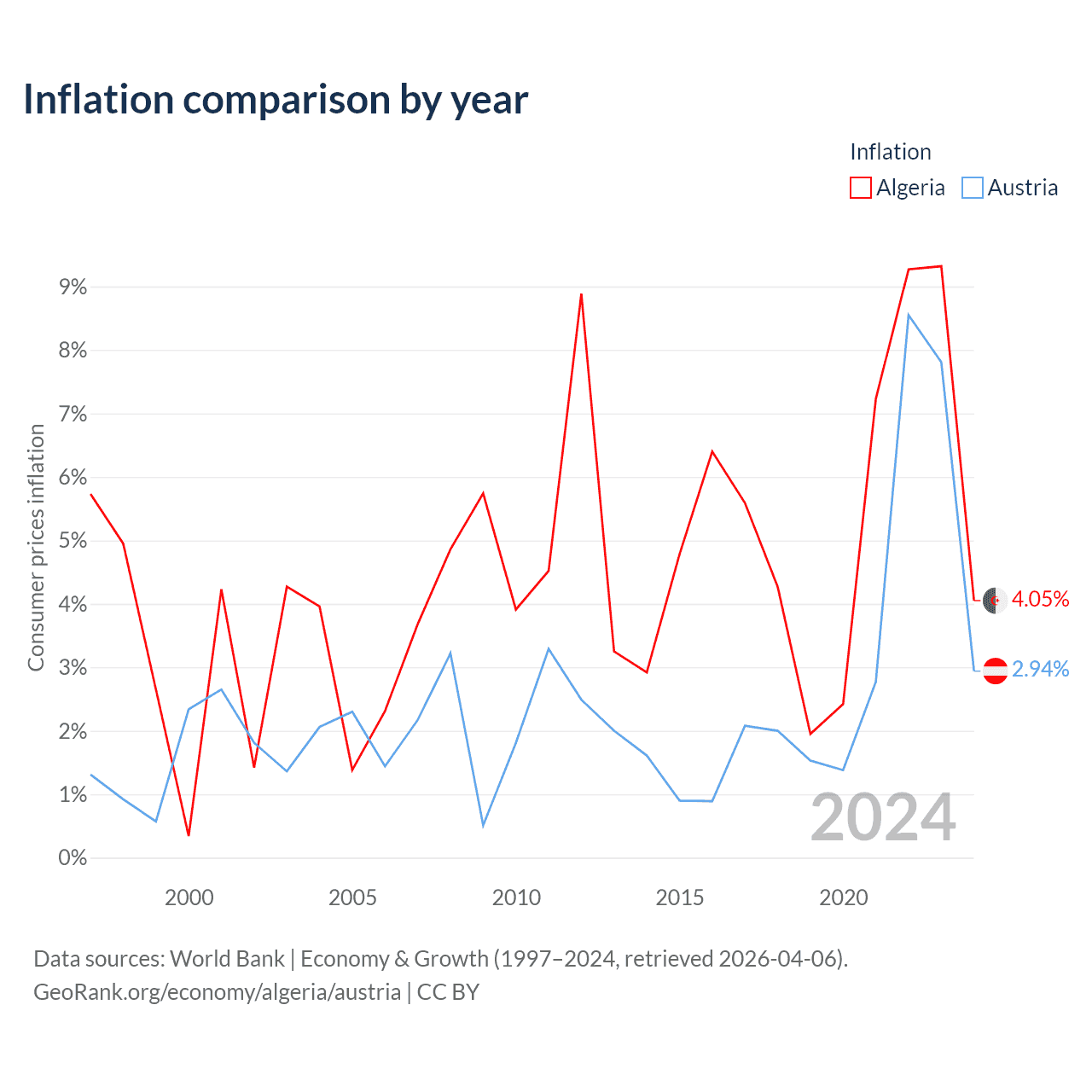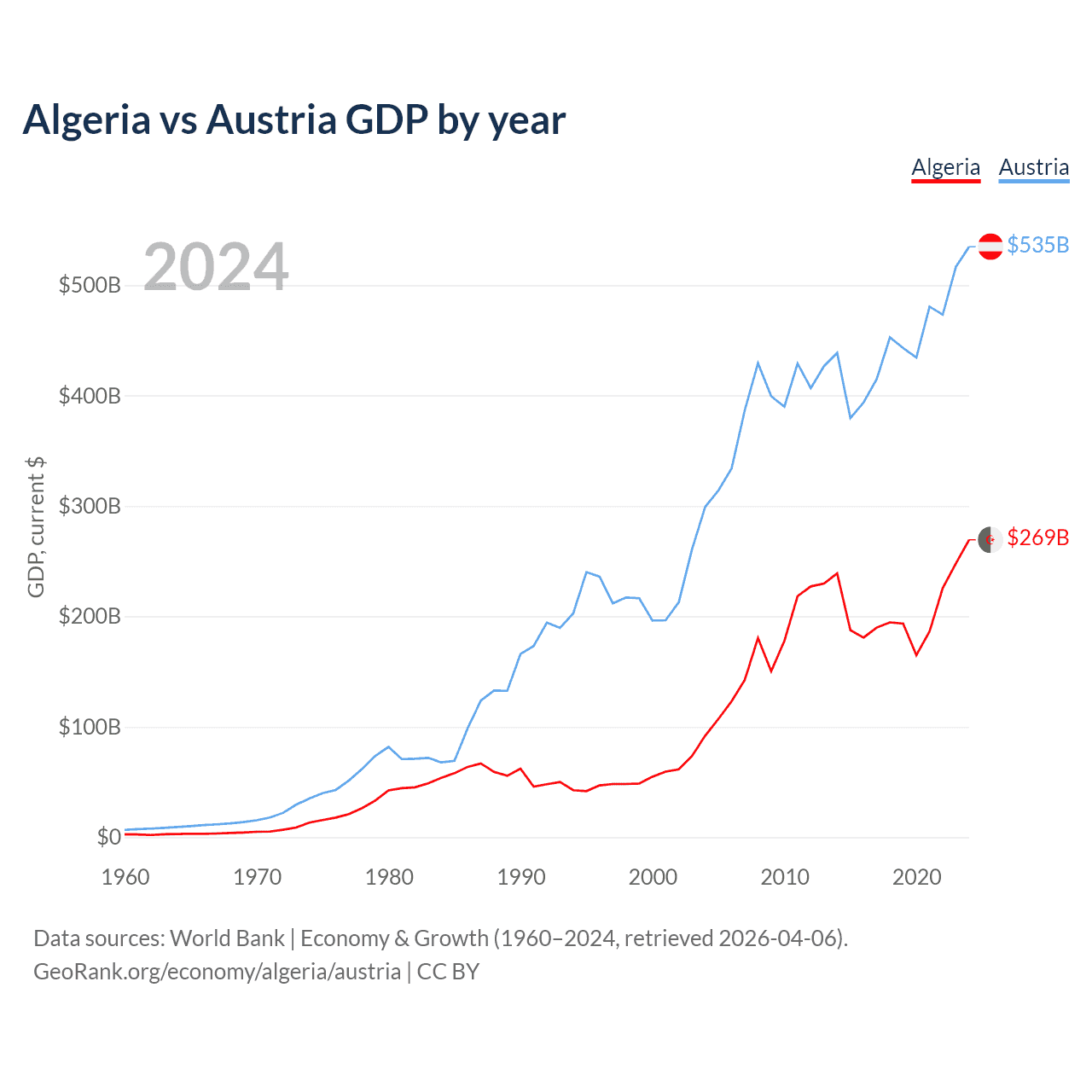 Algeria has a GDP of $269B compared to $535B for Austria, ranking 51/197 and 30/197 by economy size, respectively.