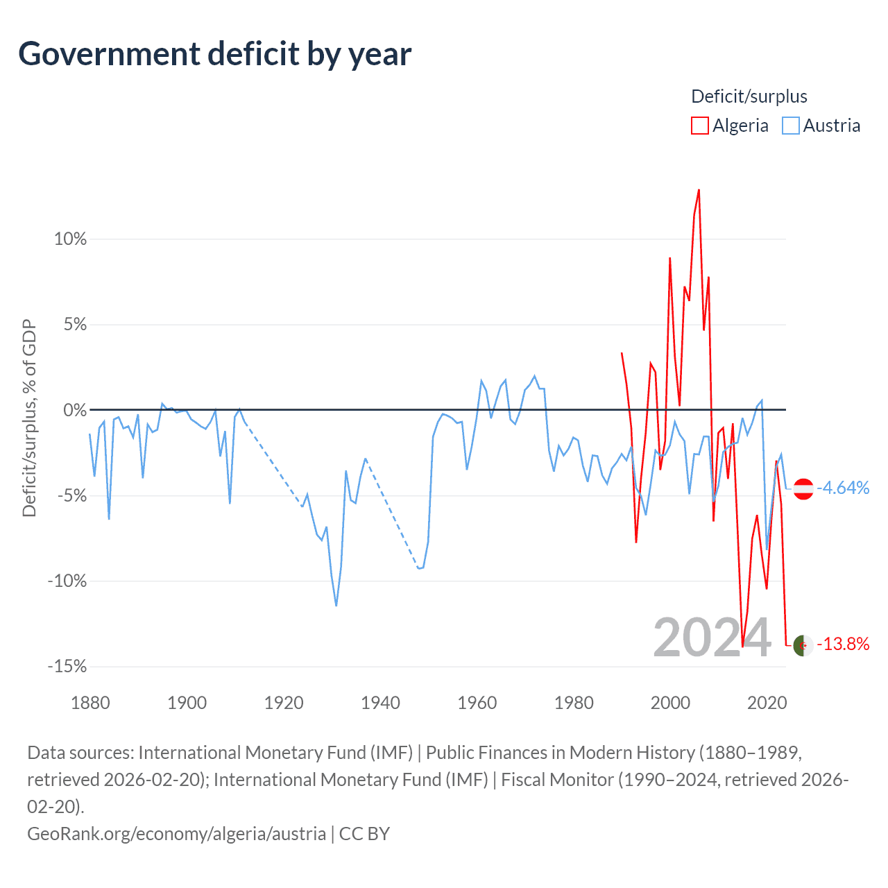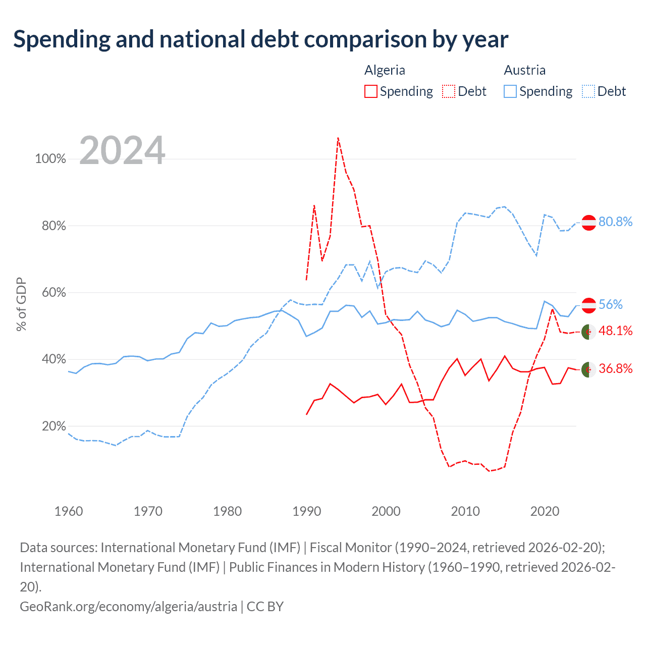 Algeria has $129B in government debt (48.1% of GDP), compared to $432B (80.8% of GDP) in Austria.