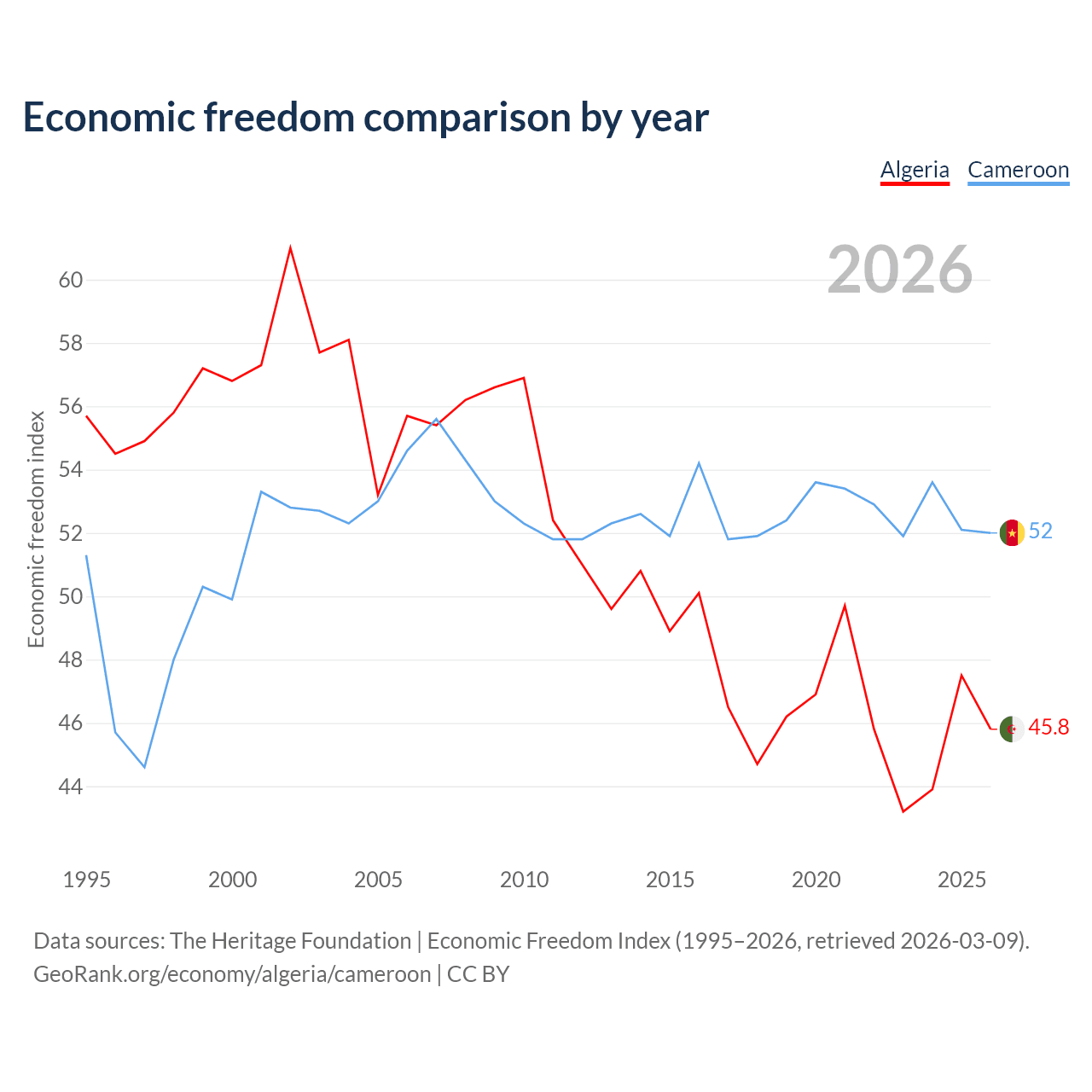 The Economic Freedom Index for Algeria is 45.8, ranking 179/197, compared to 52 for Cameroon, ranking 151/197. The chart above displays a comparison of annual changes in economic freedom indexes.