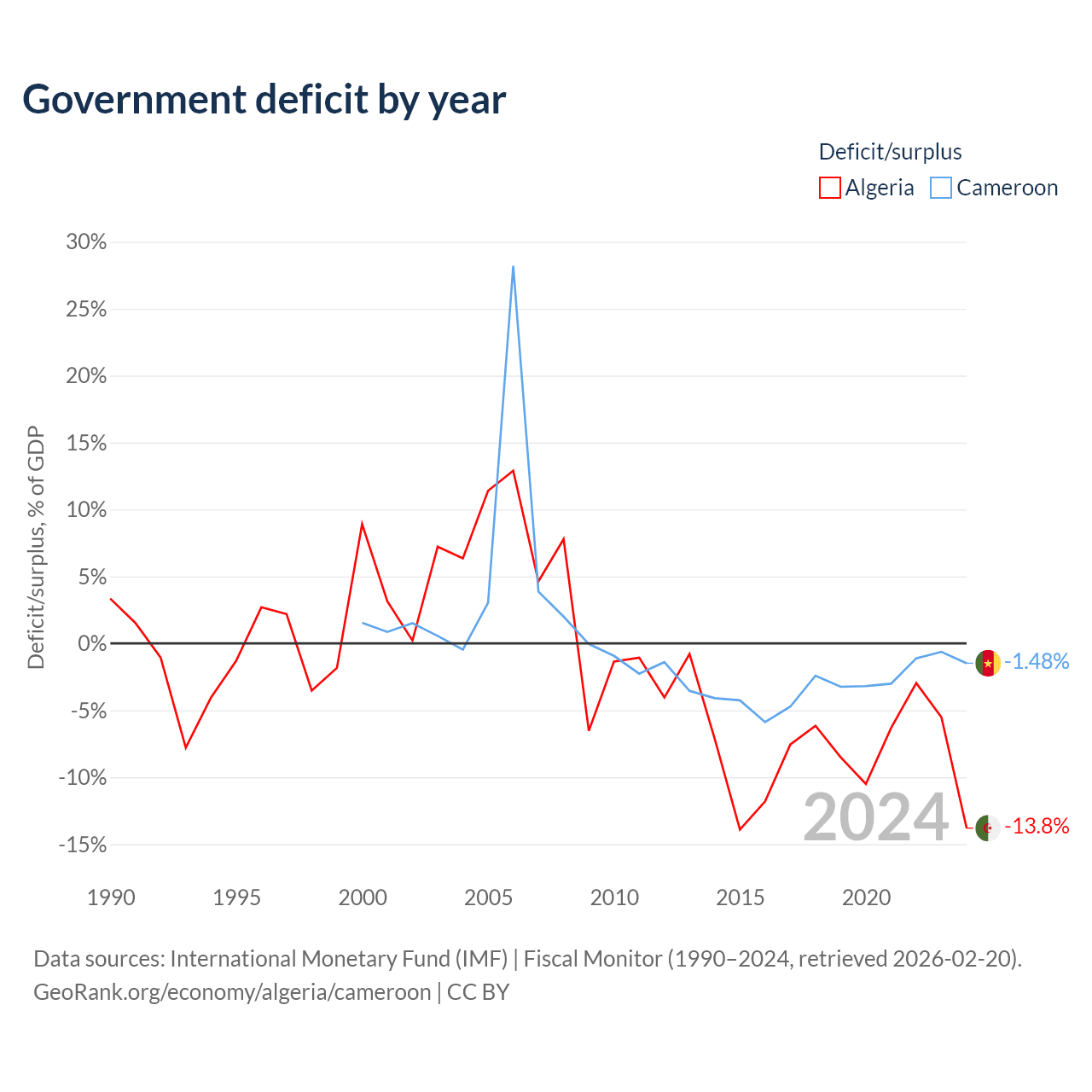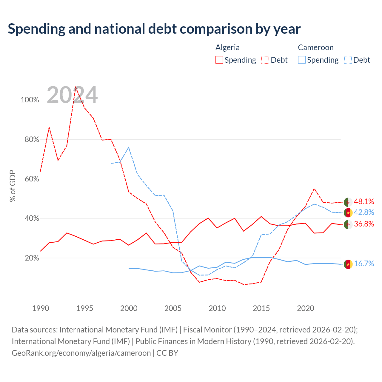 Algeria has $129B in government debt (48.1% of GDP), compared to $22.8B (42.8% of GDP) in Cameroon.