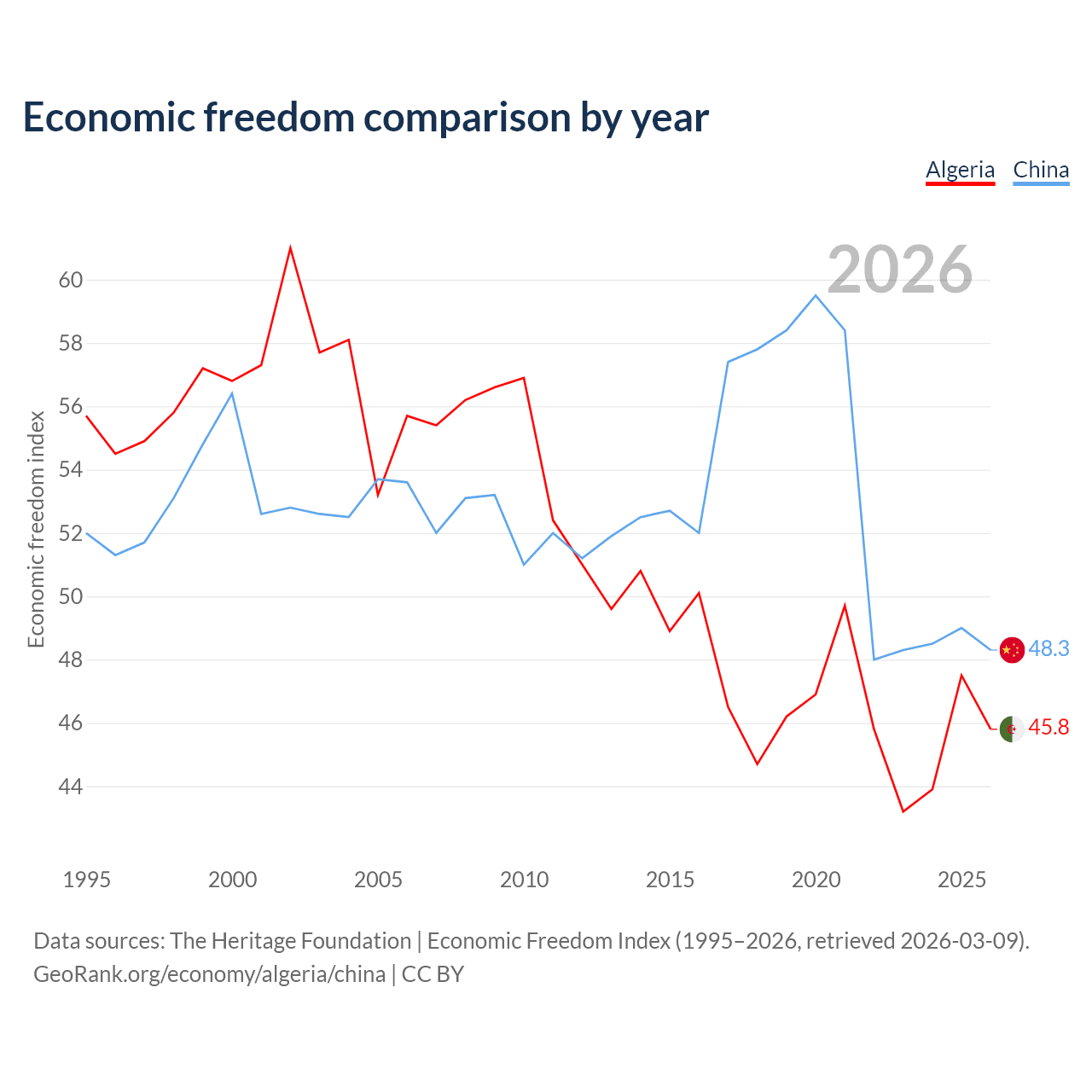 The Economic Freedom Index for Algeria is 45.8, ranking 179/197, compared to 48.3 for China, ranking 170/197. The chart above displays a comparison of annual changes in economic freedom indexes.