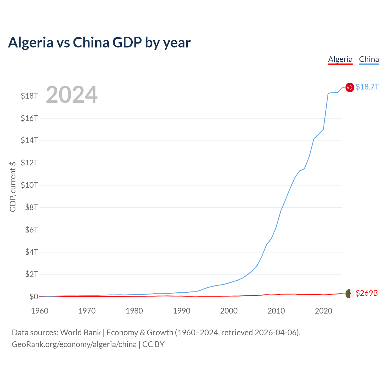 Algeria has a GDP of $269B compared to $18.7T for China, ranking 51/197 and 2/197 by economy size, respectively.
