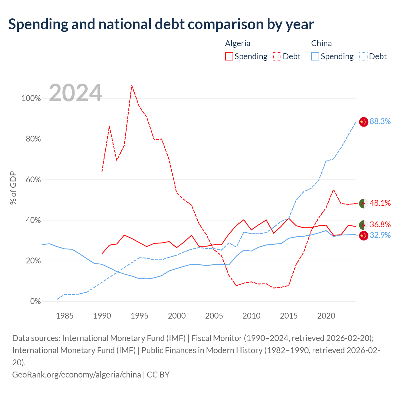 Algeria has $129B in government debt (48.1% of GDP), compared to $16.6T (88.3% of GDP) in China.