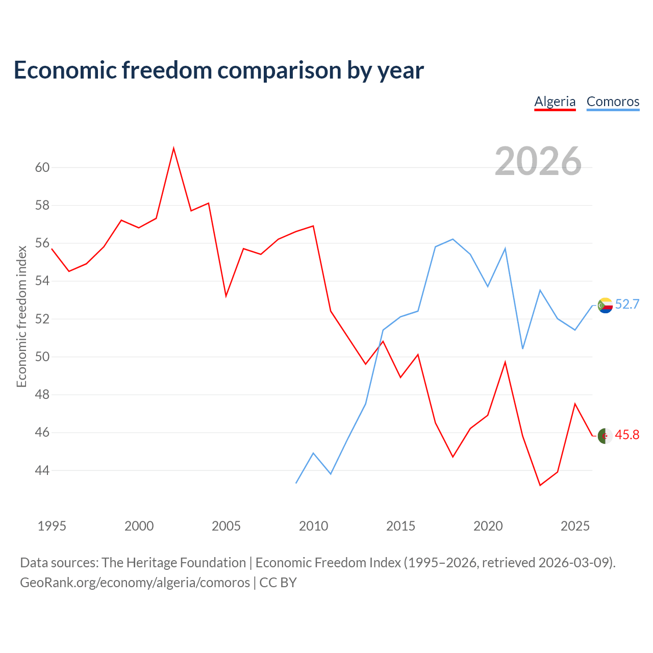 The Economic Freedom Index for Algeria is 45.8, ranking 179/197, compared to 52.7 for Comoros, ranking 145/197. The chart above displays a comparison of annual changes in economic freedom indexes.
