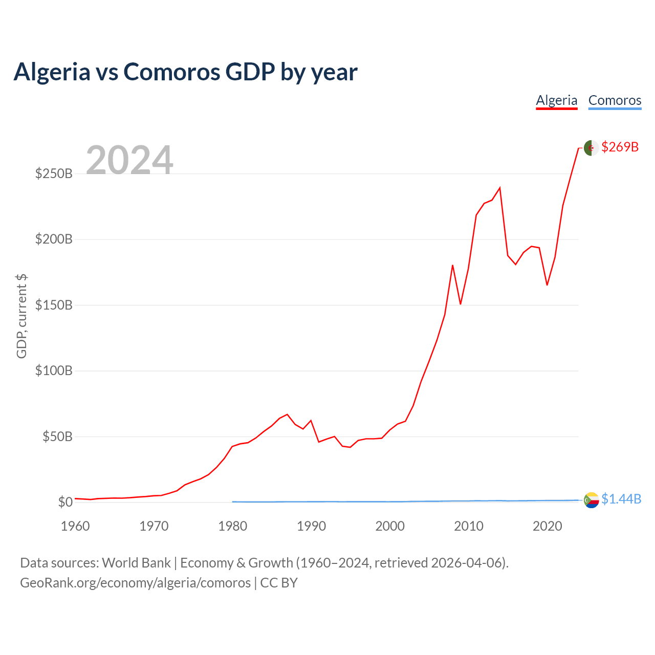 Algeria has a GDP of $269B compared to $1.44B for Comoros, ranking 51/197 and 183/197 by economy size, respectively.