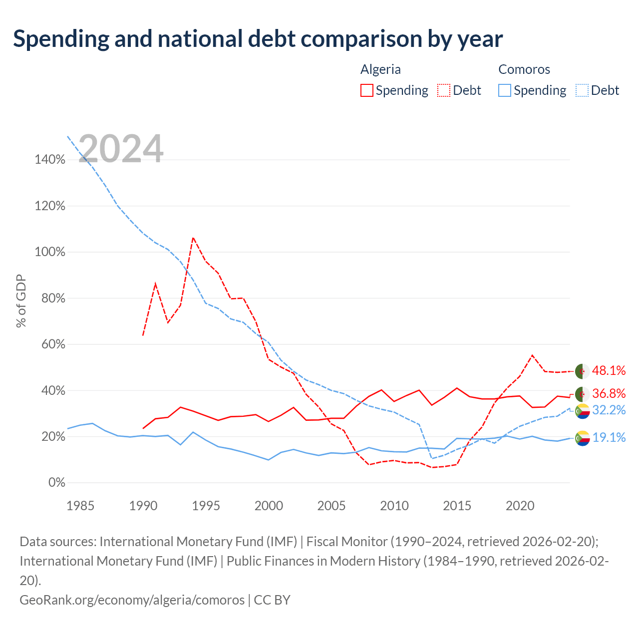 Algeria has $129B in government debt (48.1% of GDP), compared to $463M (32.2% of GDP) in Comoros.