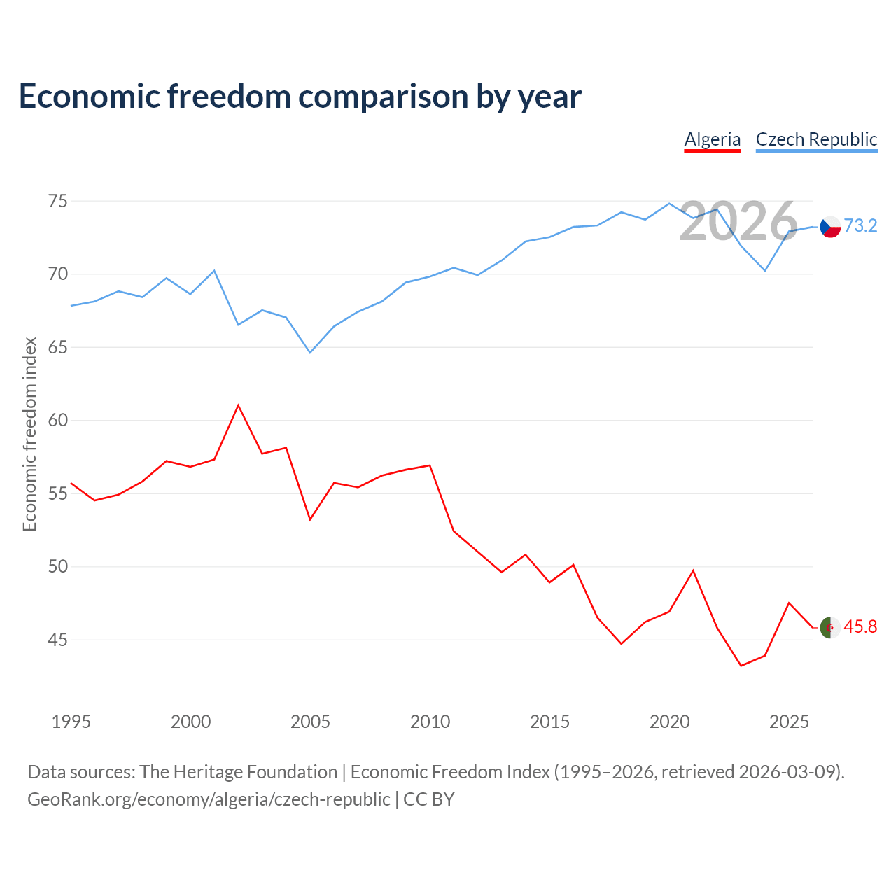The Economic Freedom Index for Algeria is 45.8, ranking 179/197, compared to 73.2 for the Czech Republic, ranking 25/197. The chart above displays a comparison of annual changes in economic freedom indexes.