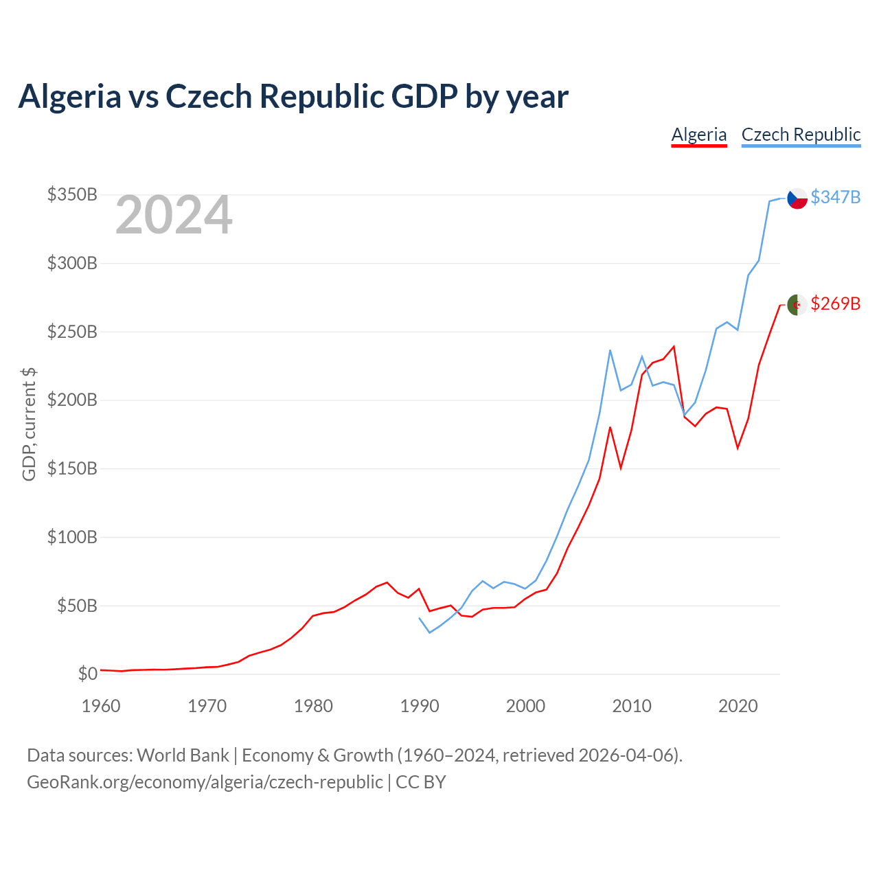 Algeria has a GDP of $269B compared to $347B for the Czech Republic, ranking 51/197 and 44/197 by economy size, respectively.