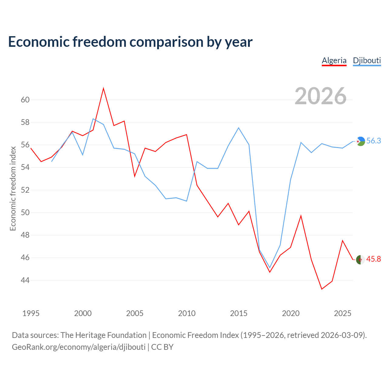 The Economic Freedom Index for Algeria is 45.8, ranking 179/197, compared to 56.3 for Djibouti, ranking 122/197. The chart above displays a comparison of annual changes in economic freedom indexes.