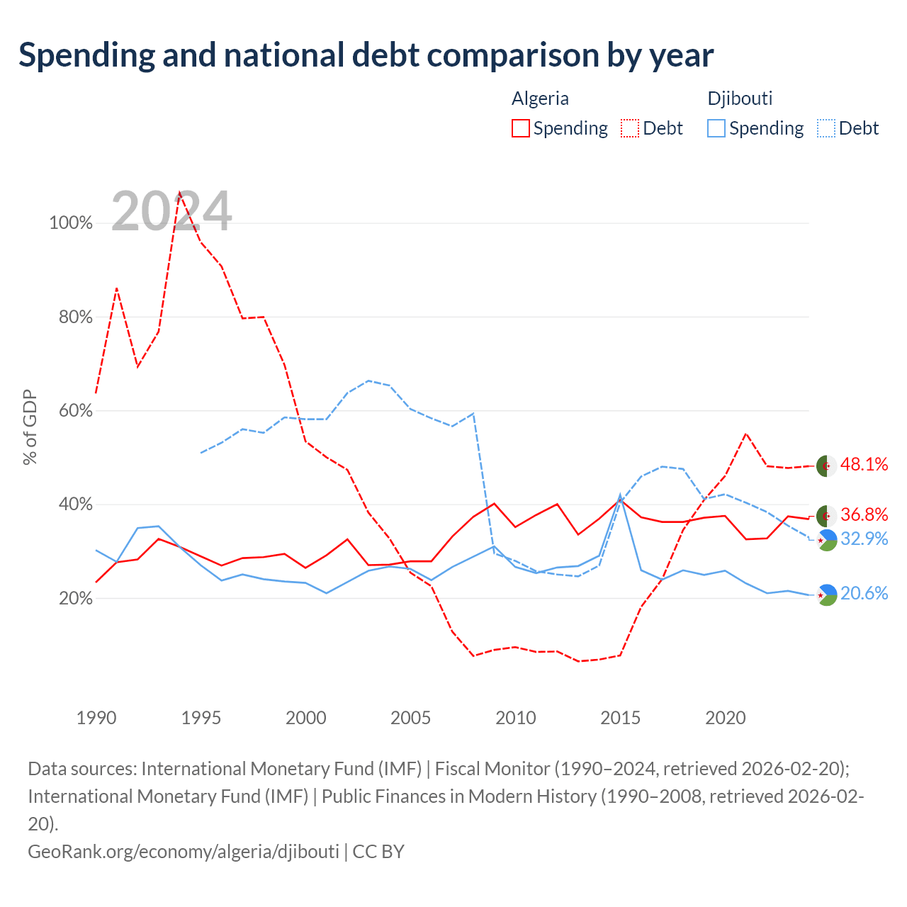 Algeria has $129B in government debt (48.1% of GDP), compared to $1.36B (32.9% of GDP) in Djibouti.