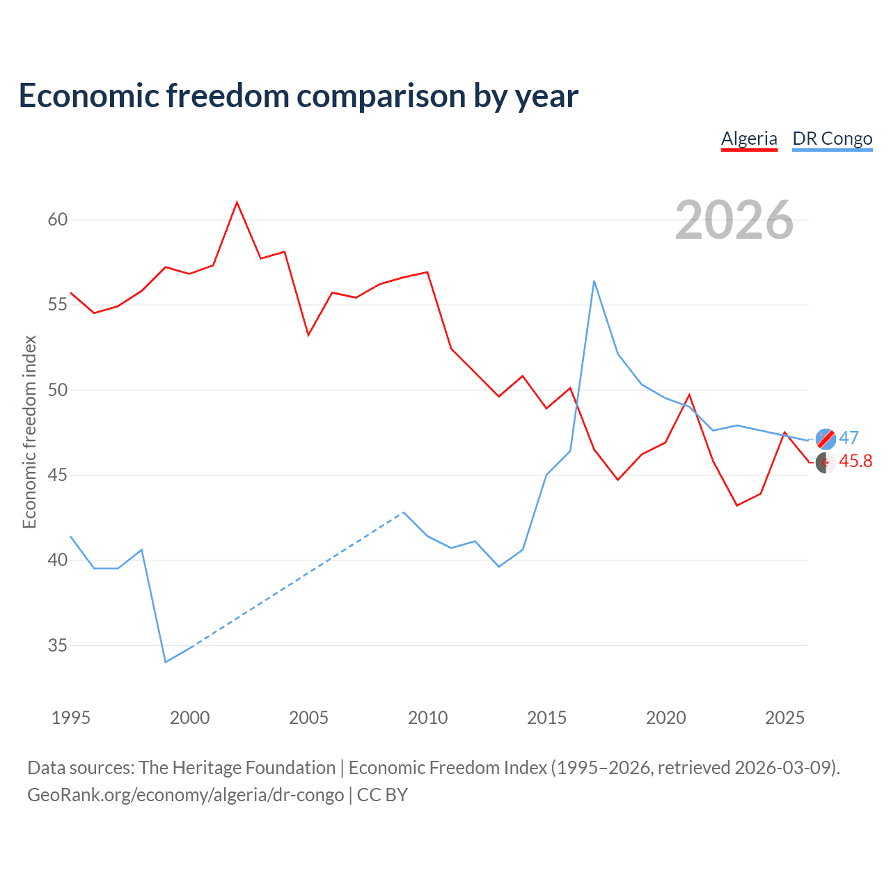 The Economic Freedom Index for Algeria is 45.8, ranking 179/197, compared to 47 for the DR Congo, ranking 176/197. The chart above displays a comparison of annual changes in economic freedom indexes.