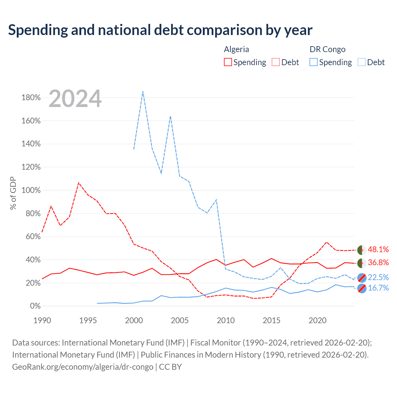Algeria has $129B in government debt (48.1% of GDP), compared to $16B (22.5% of GDP) in the DR Congo.