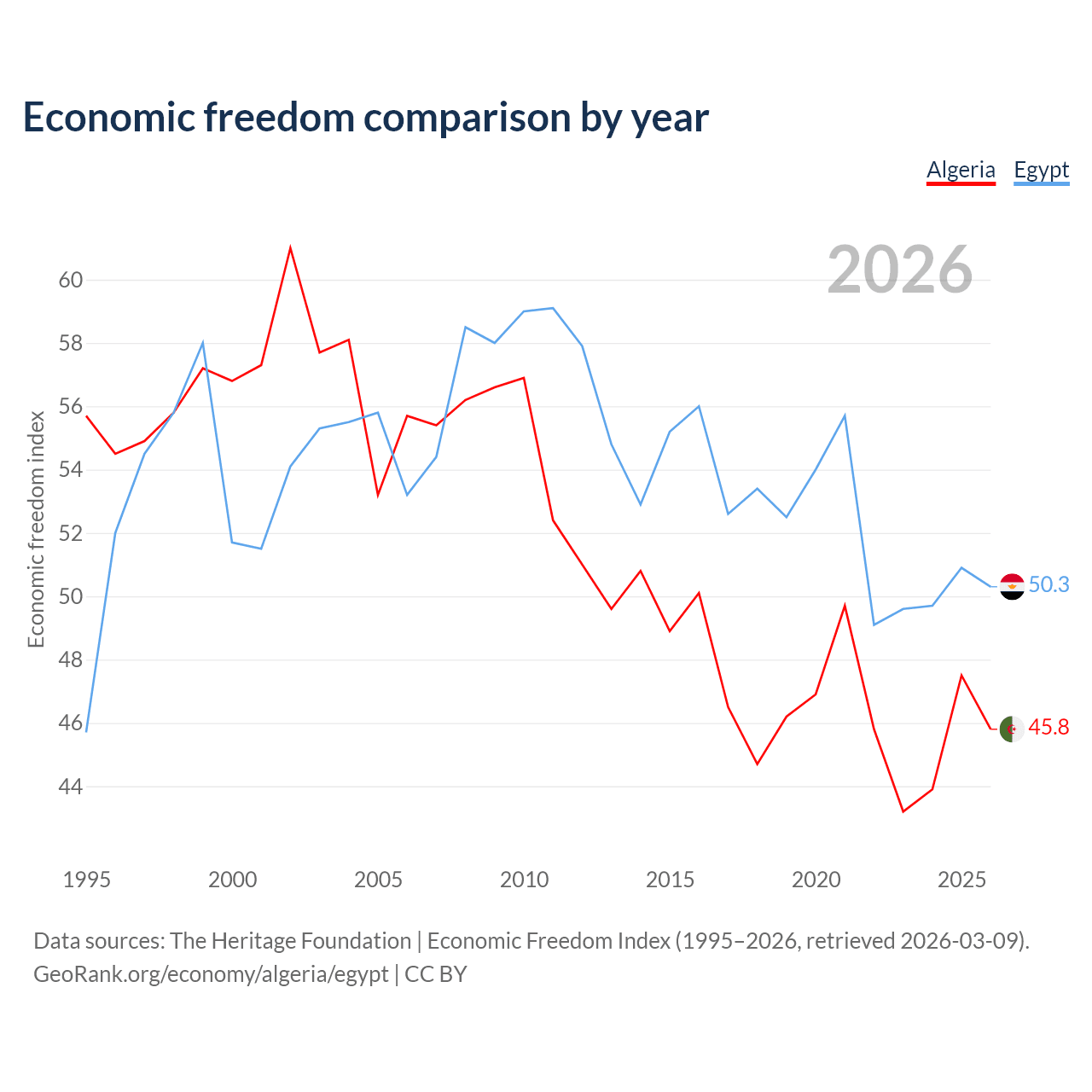 The Economic Freedom Index for Algeria is 45.8, ranking 179/197, compared to 50.3 for Egypt, ranking 160/197. The chart above displays a comparison of annual changes in economic freedom indexes.