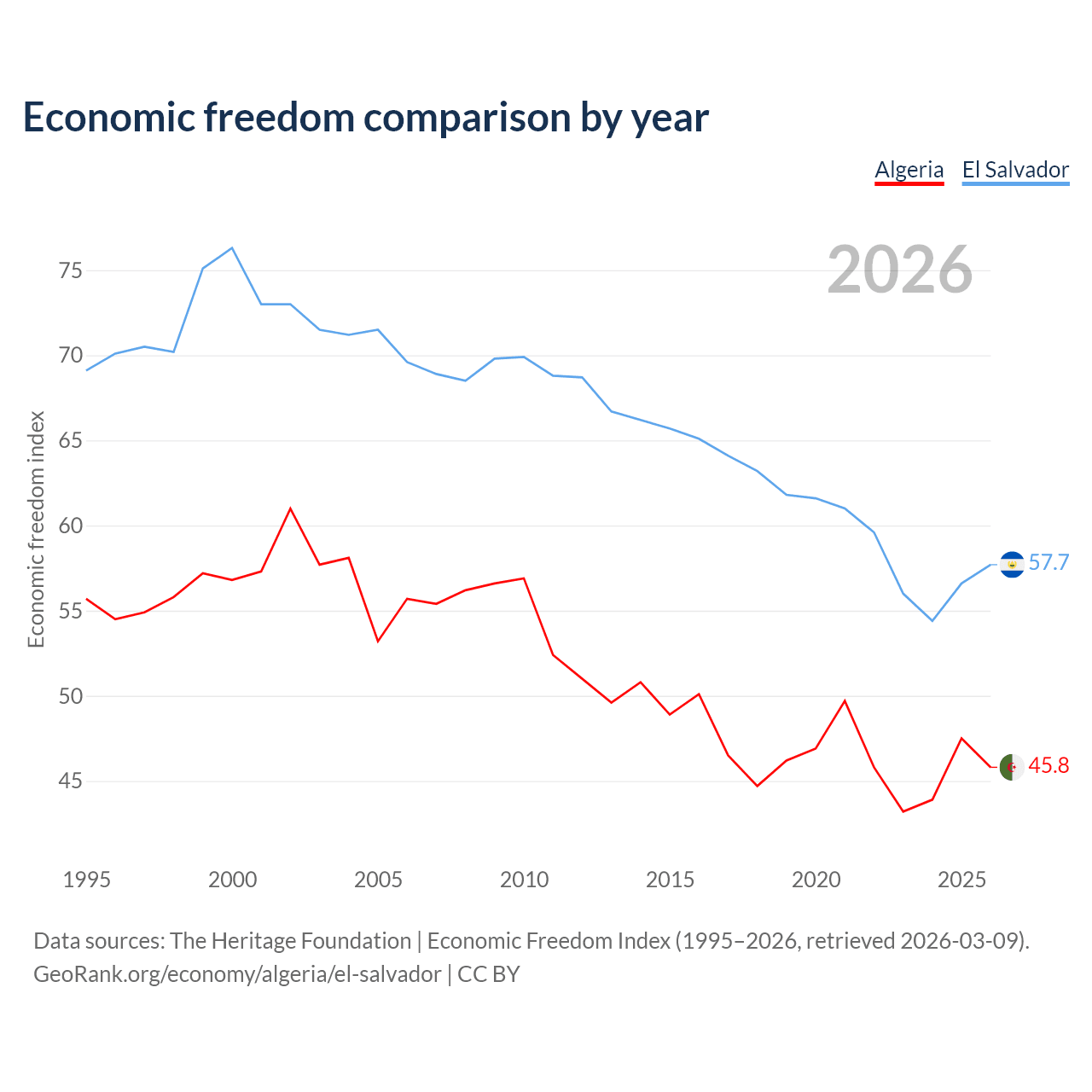 The Economic Freedom Index for Algeria is 45.8, ranking 179/197, compared to 57.7 for El Salvador, ranking 114/197. The chart above displays a comparison of annual changes in economic freedom indexes.