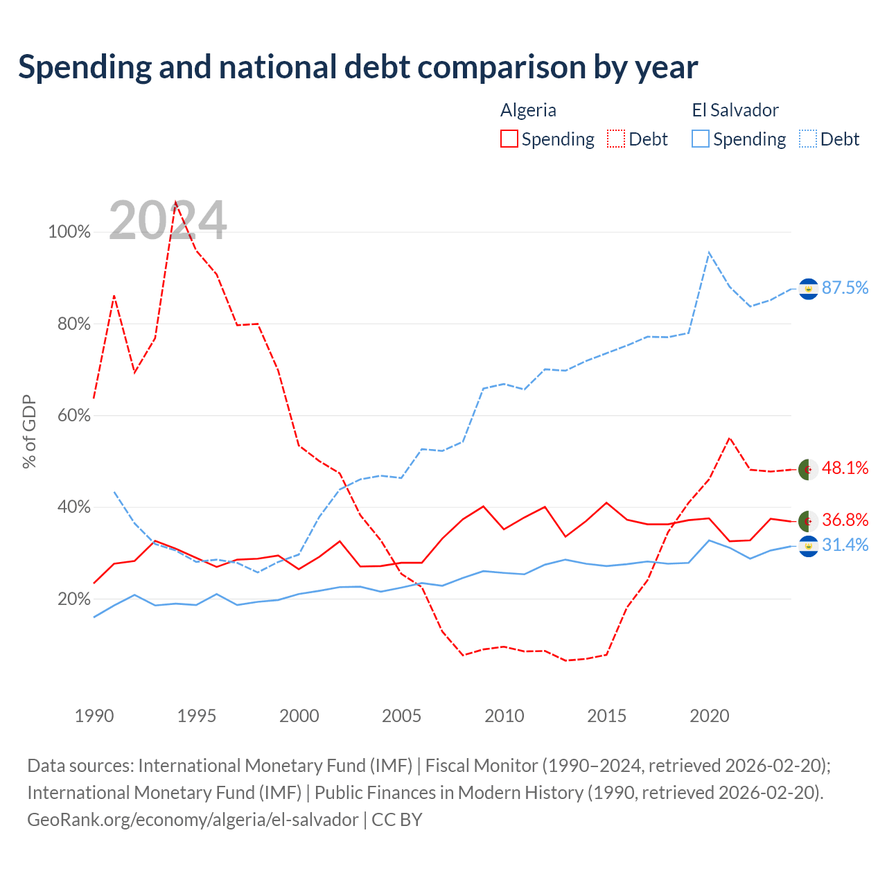 Algeria has $129B in government debt (48.1% of GDP), compared to $30.9B (87.5% of GDP) in El Salvador.