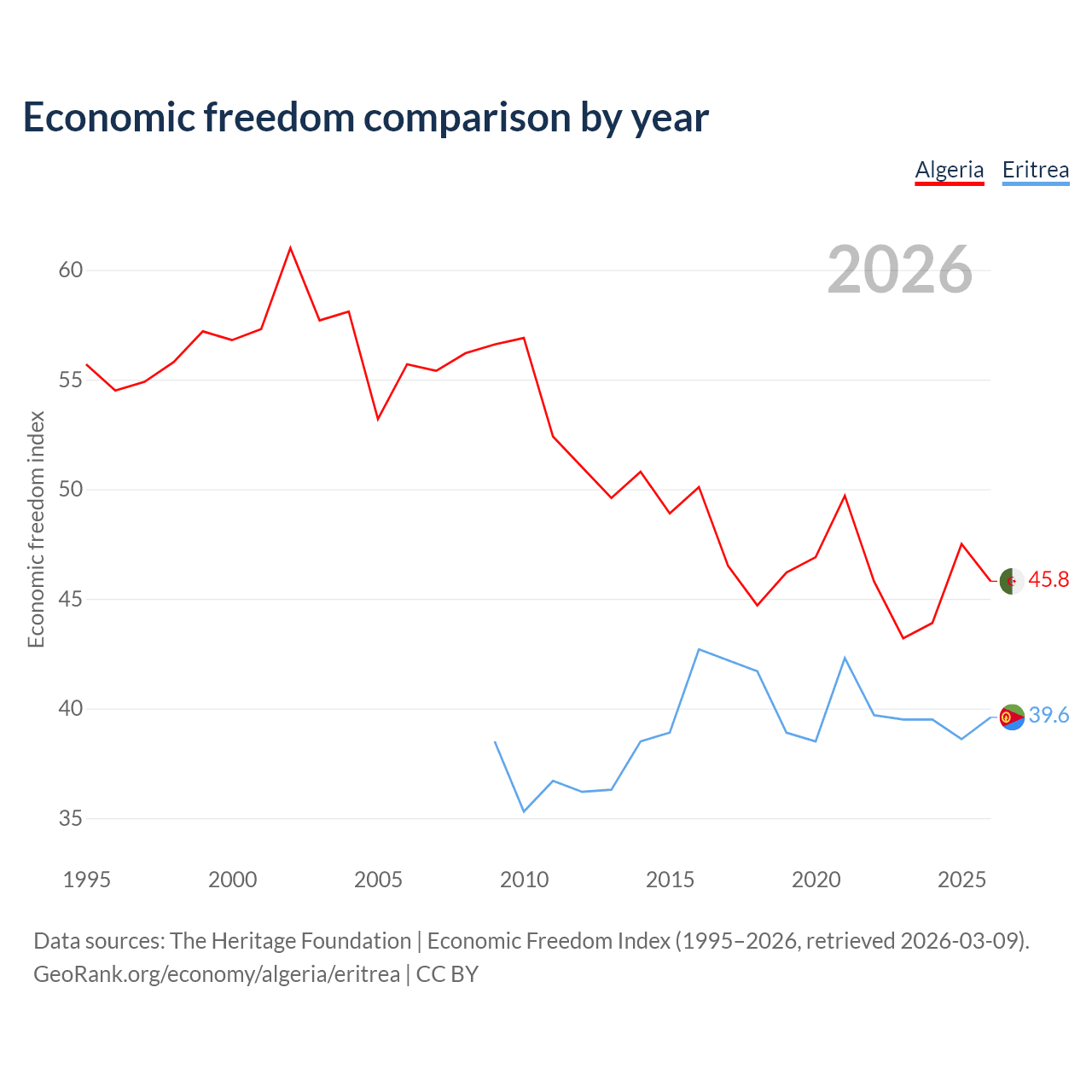 The Economic Freedom Index for Algeria is 45.8, ranking 179/197, compared to 39.6 for Eritrea, ranking 188/197. The chart above displays a comparison of annual changes in economic freedom indexes.