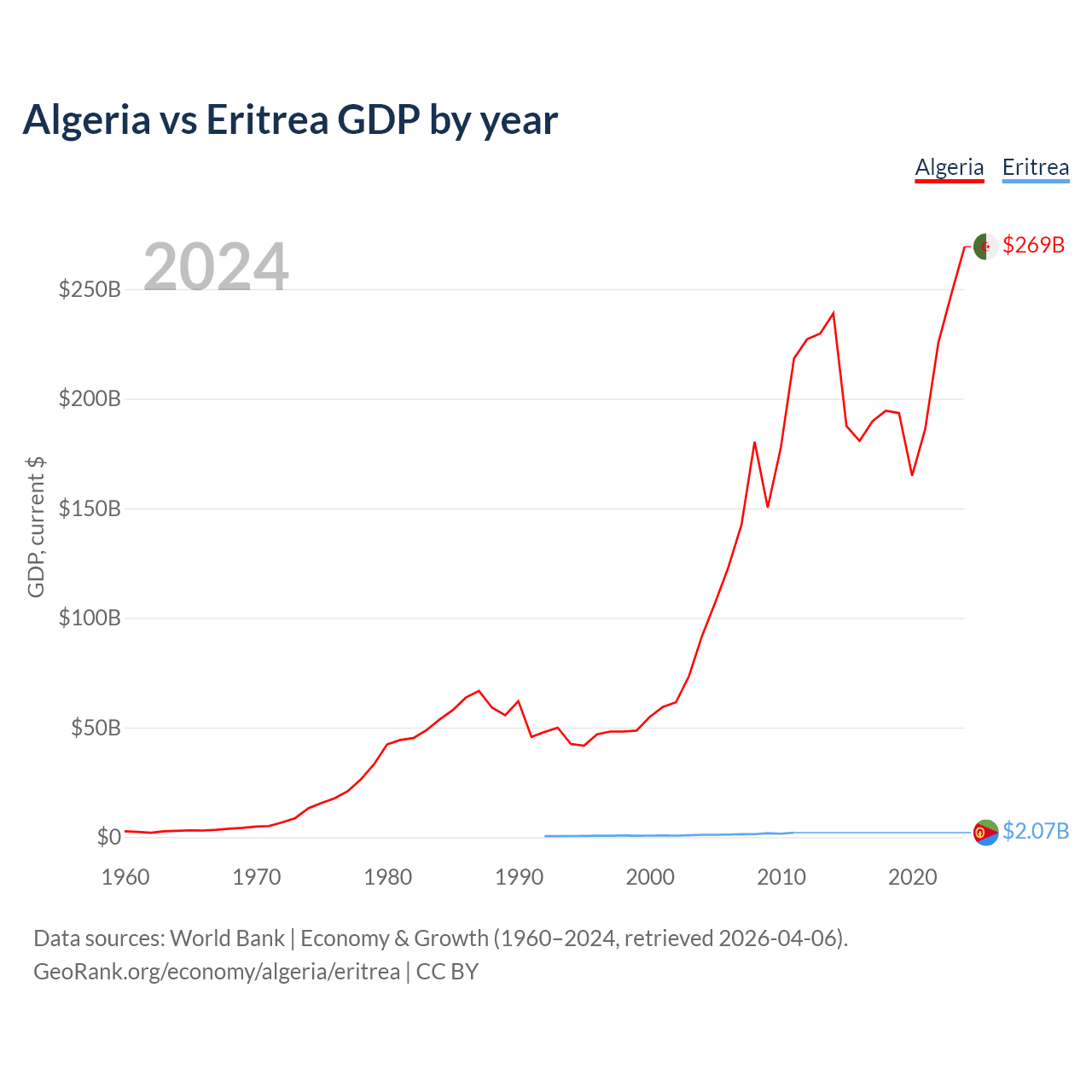 Algeria has a GDP of $269B compared to $2.07B for Eritrea, ranking 51/197 and 179/197 by economy size, respectively.