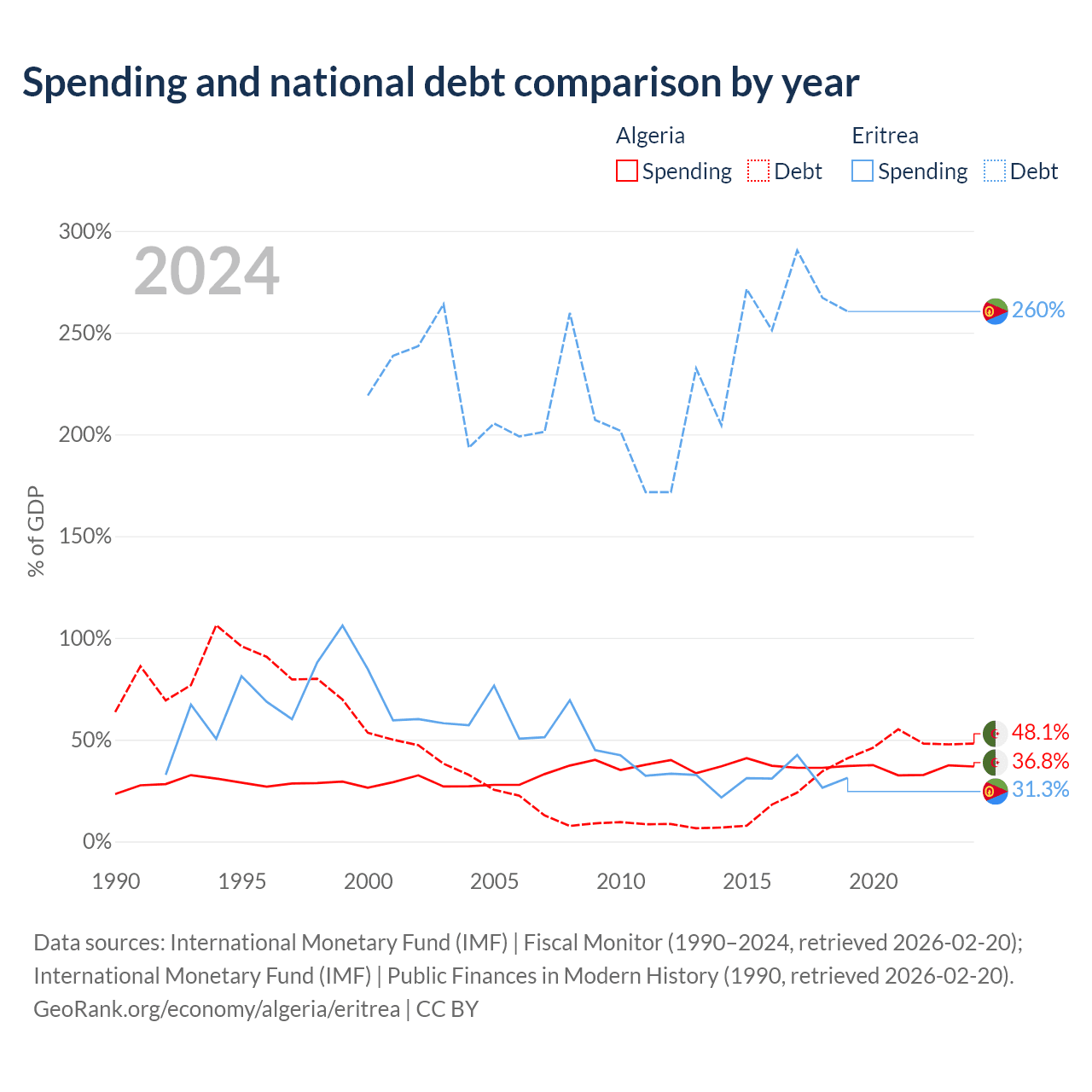 Algeria has $129B in government debt (48.1% of GDP), compared to $3.54B (260.4% of GDP) in Eritrea.
