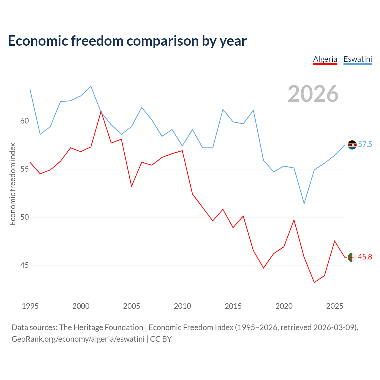 The Economic Freedom Index for Algeria is 45.8, ranking 179/197, compared to 57.5 for Eswatini, ranking 116/197. The chart above displays a comparison of annual changes in economic freedom indexes.