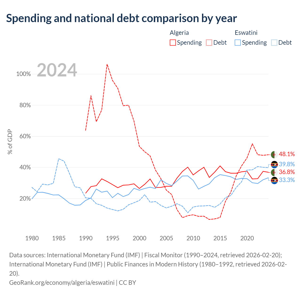 Algeria has $129B in government debt (48.1% of GDP), compared to $1.93B (39.8% of GDP) in Eswatini.