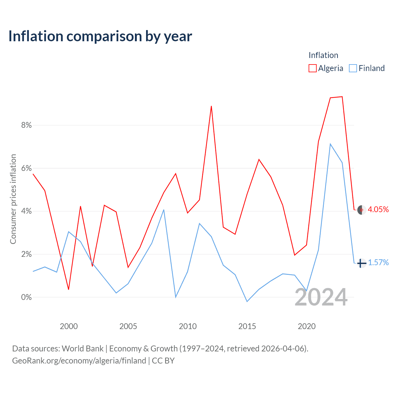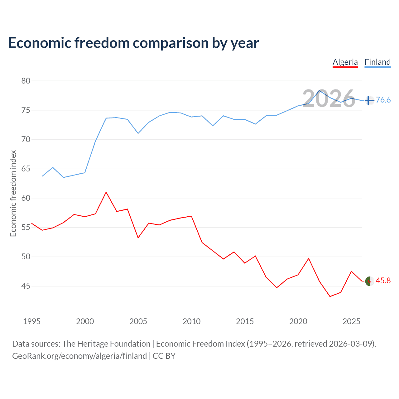 The Economic Freedom Index for Algeria is 45.8, ranking 179/197, compared to 76.6 for Finland, ranking 15/197. The chart above displays a comparison of annual changes in economic freedom indexes.