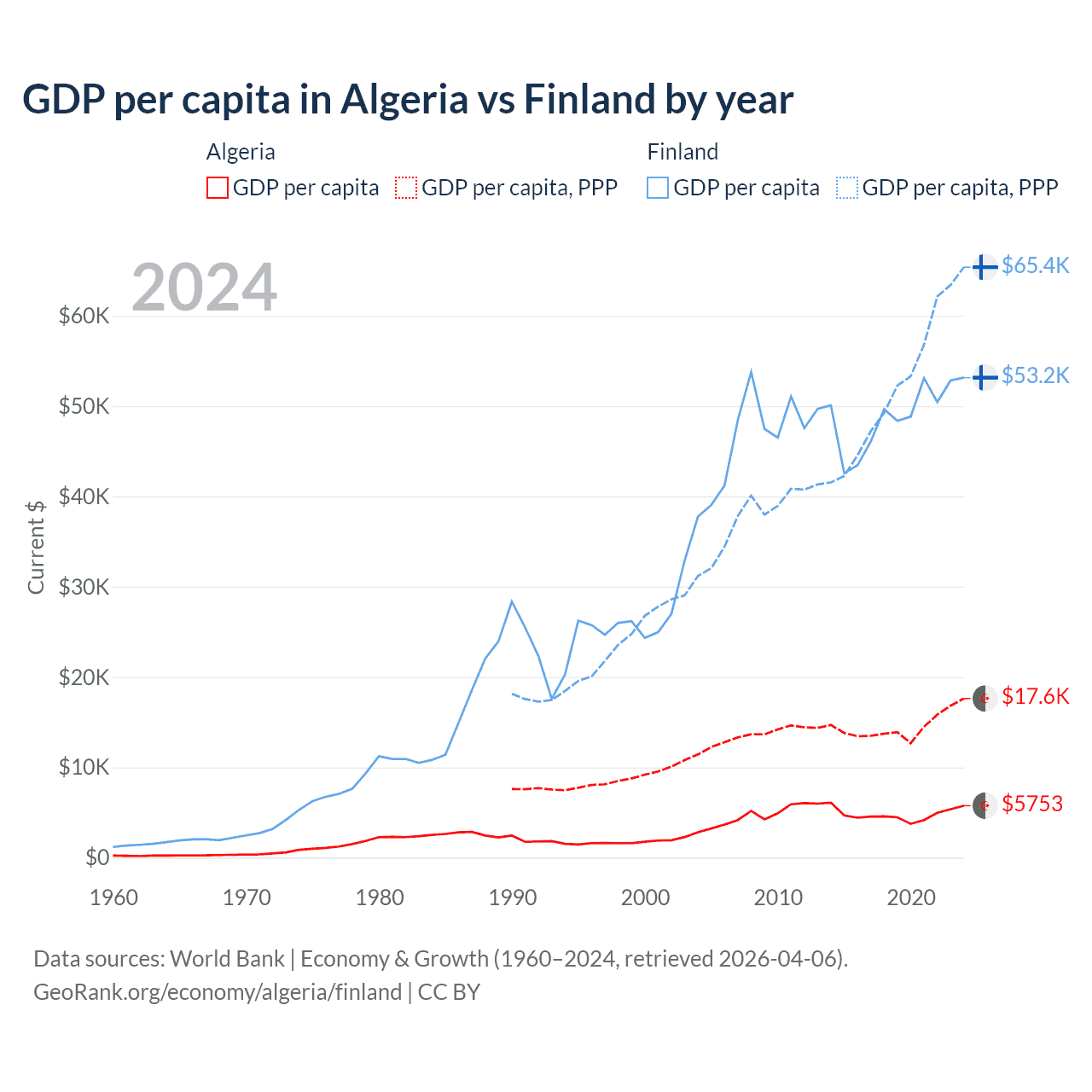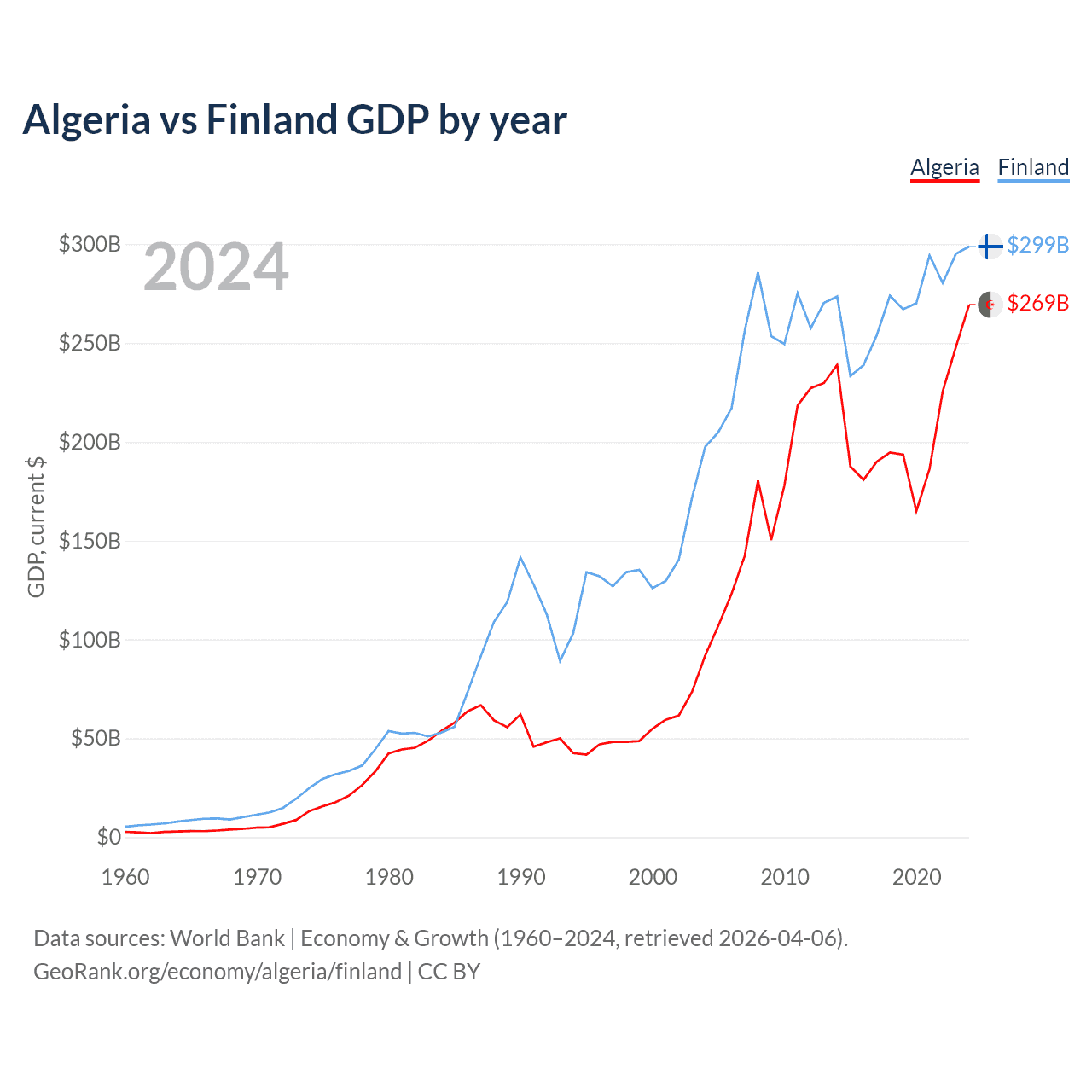 Algeria has a GDP of $269B compared to $299B for Finland, ranking 51/197 and 47/197 by economy size, respectively.