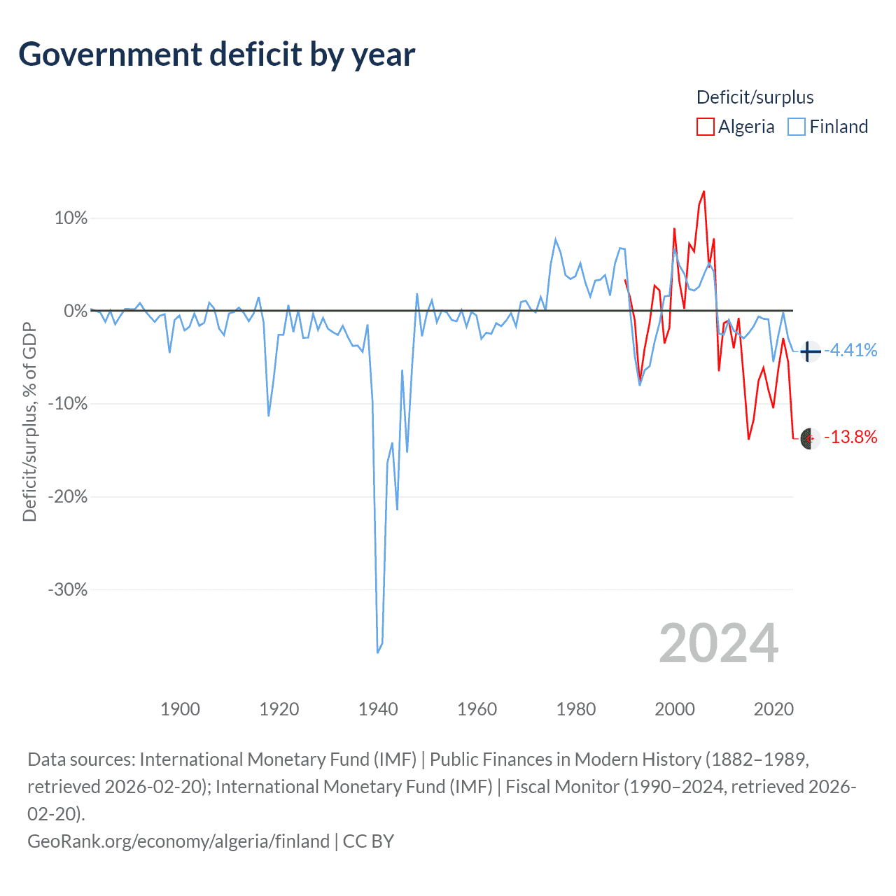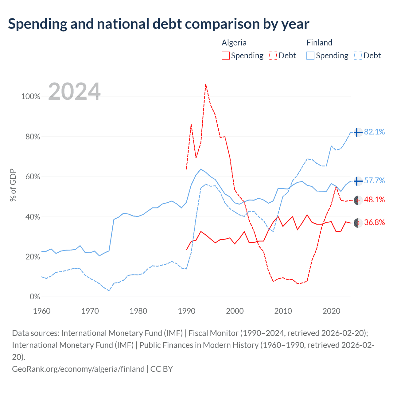 Algeria has $129B in government debt (48.1% of GDP), compared to $245B (82.1% of GDP) in Finland.