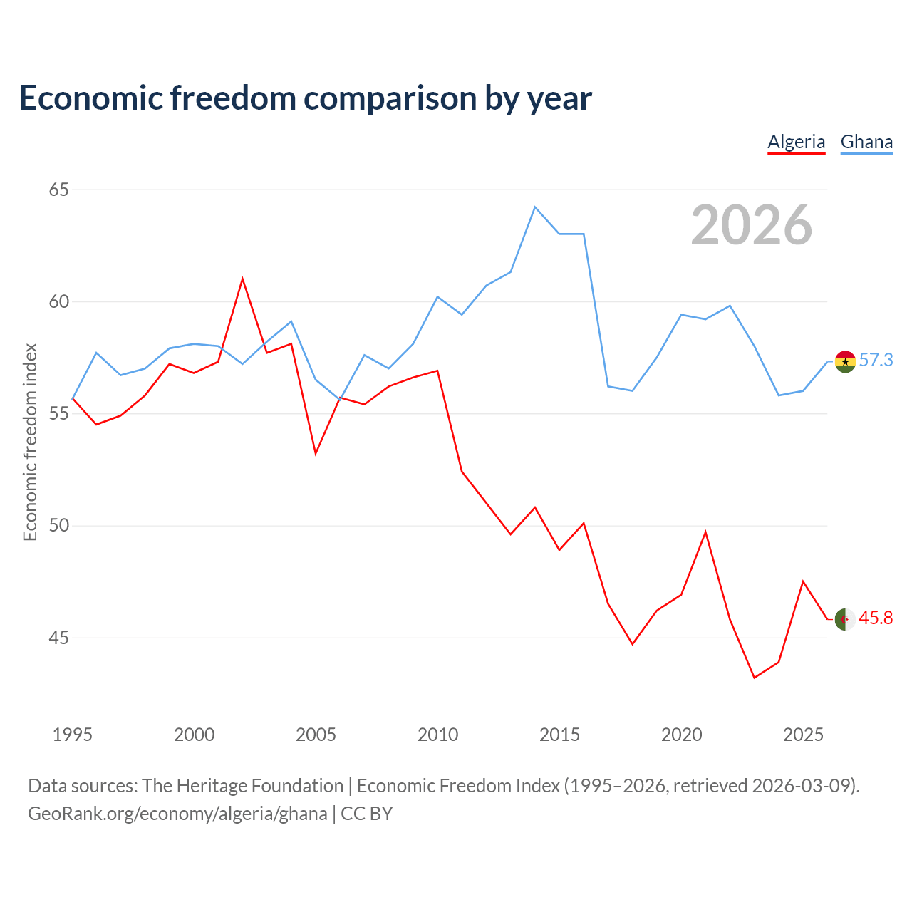 The Economic Freedom Index for Algeria is 45.8, ranking 179/197, compared to 57.3 for Ghana, ranking 118/197. The chart above displays a comparison of annual changes in economic freedom indexes.