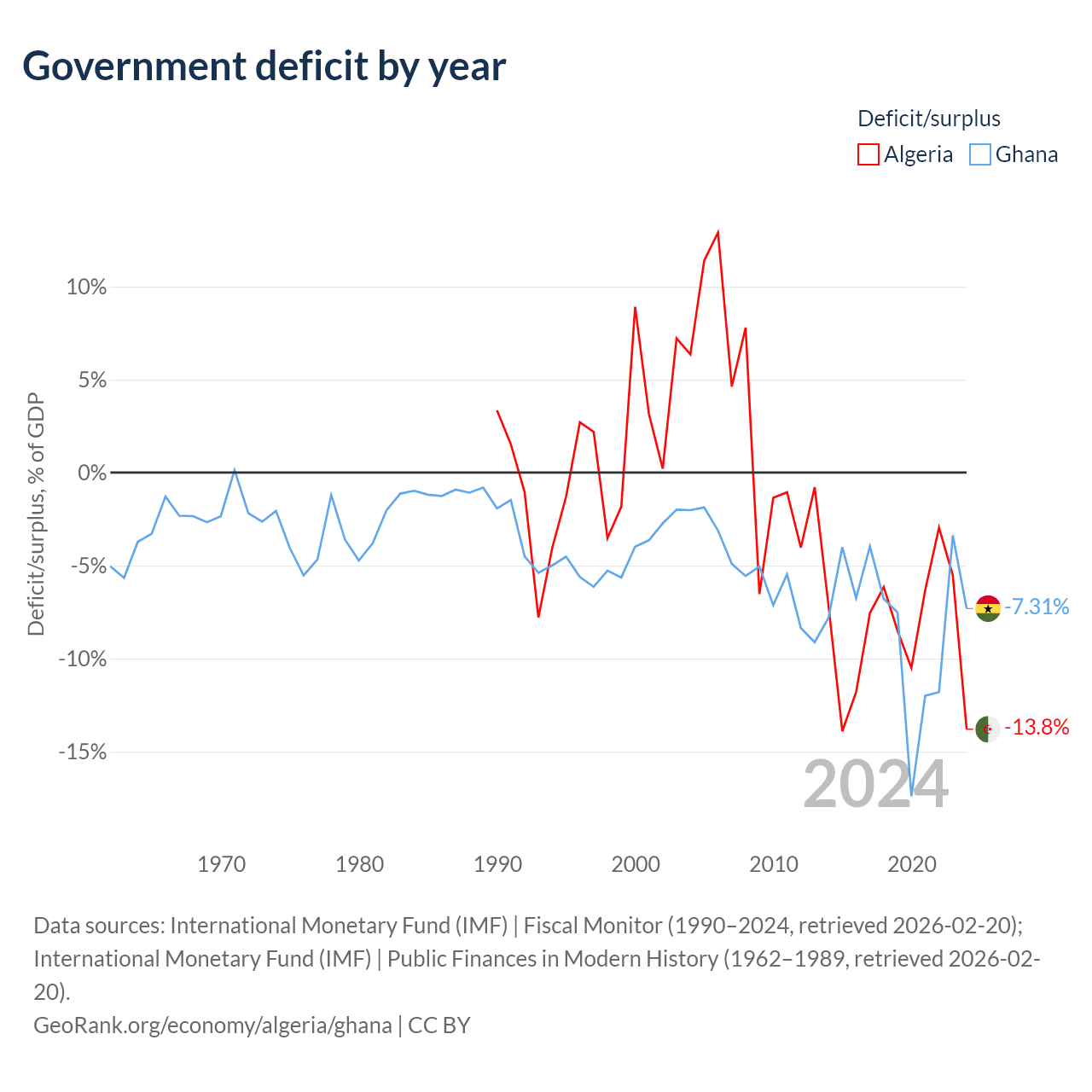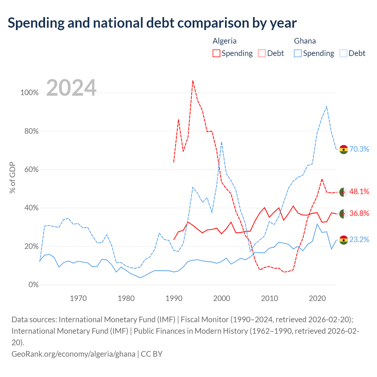 Algeria has $129B in government debt (48.1% of GDP), compared to $57.9B (70.3% of GDP) in Ghana.