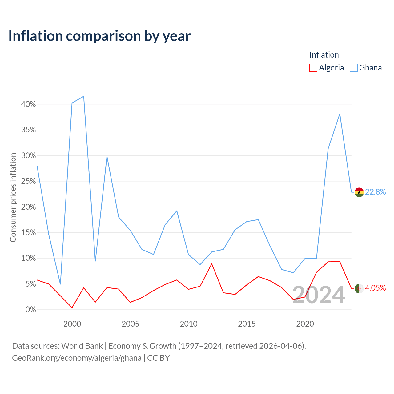 Algeria has a GDP of $269B compared to $82.3B for Ghana, ranking 51/197 and 80/197 by economy size, respectively.