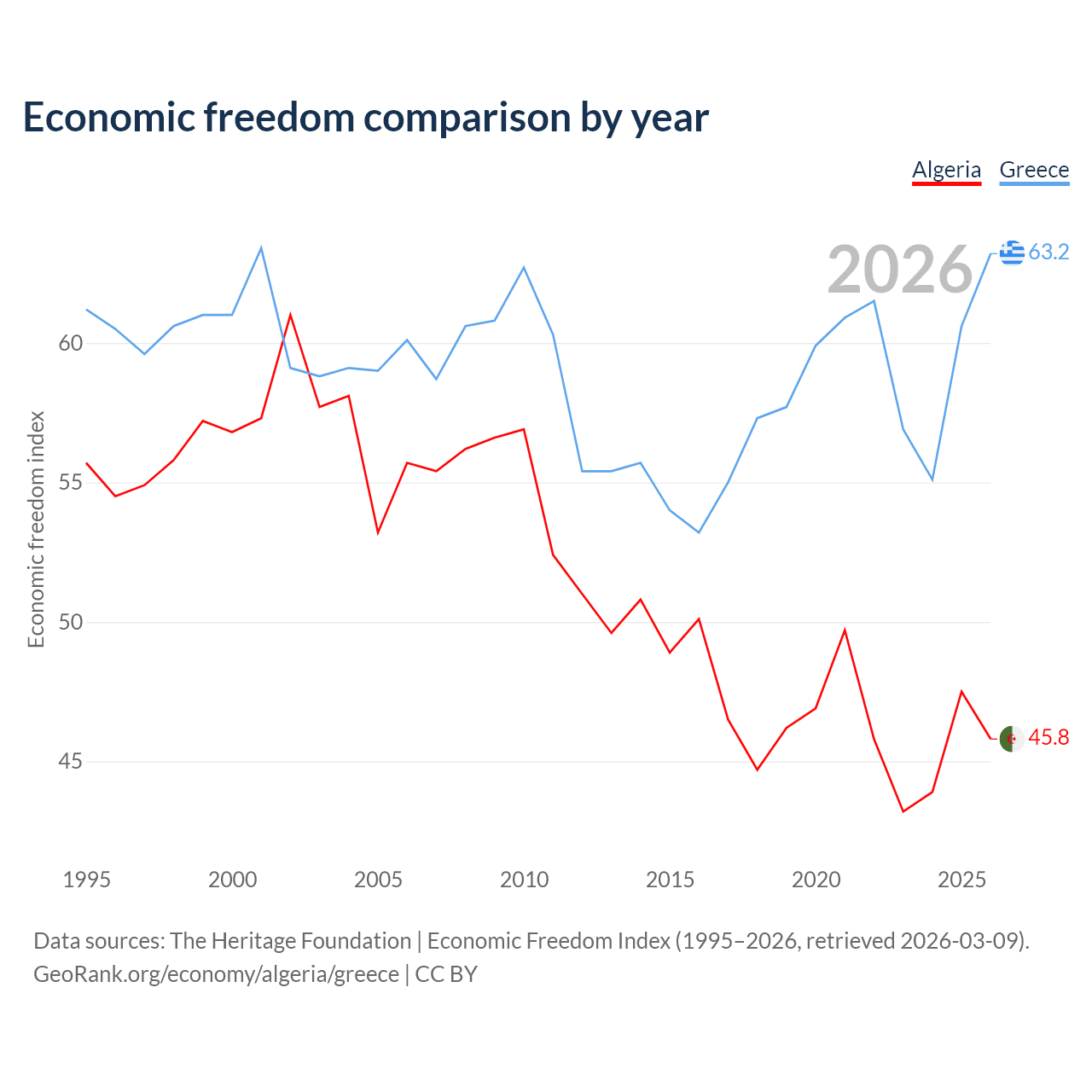 The Economic Freedom Index for Algeria is 45.8, ranking 179/197, compared to 63.2 for Greece, ranking 82/197. The chart above displays a comparison of annual changes in economic freedom indexes.