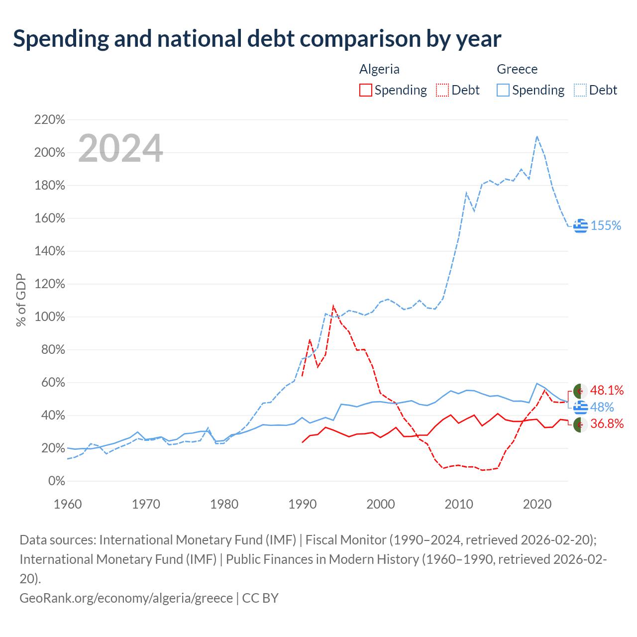 Algeria has $129B in government debt (48.1% of GDP), compared to $397B (154.8% of GDP) in Greece.