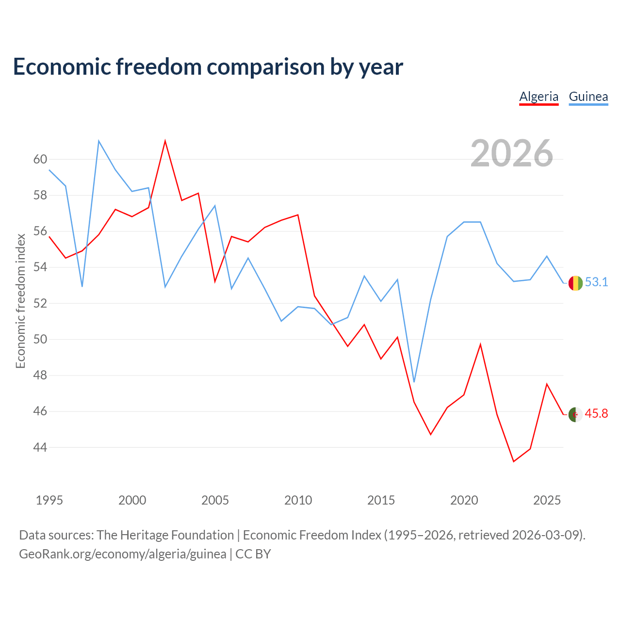 The Economic Freedom Index for Algeria is 45.8, ranking 179/197, compared to 53.1 for Guinea, ranking 141/197. The chart above displays a comparison of annual changes in economic freedom indexes.