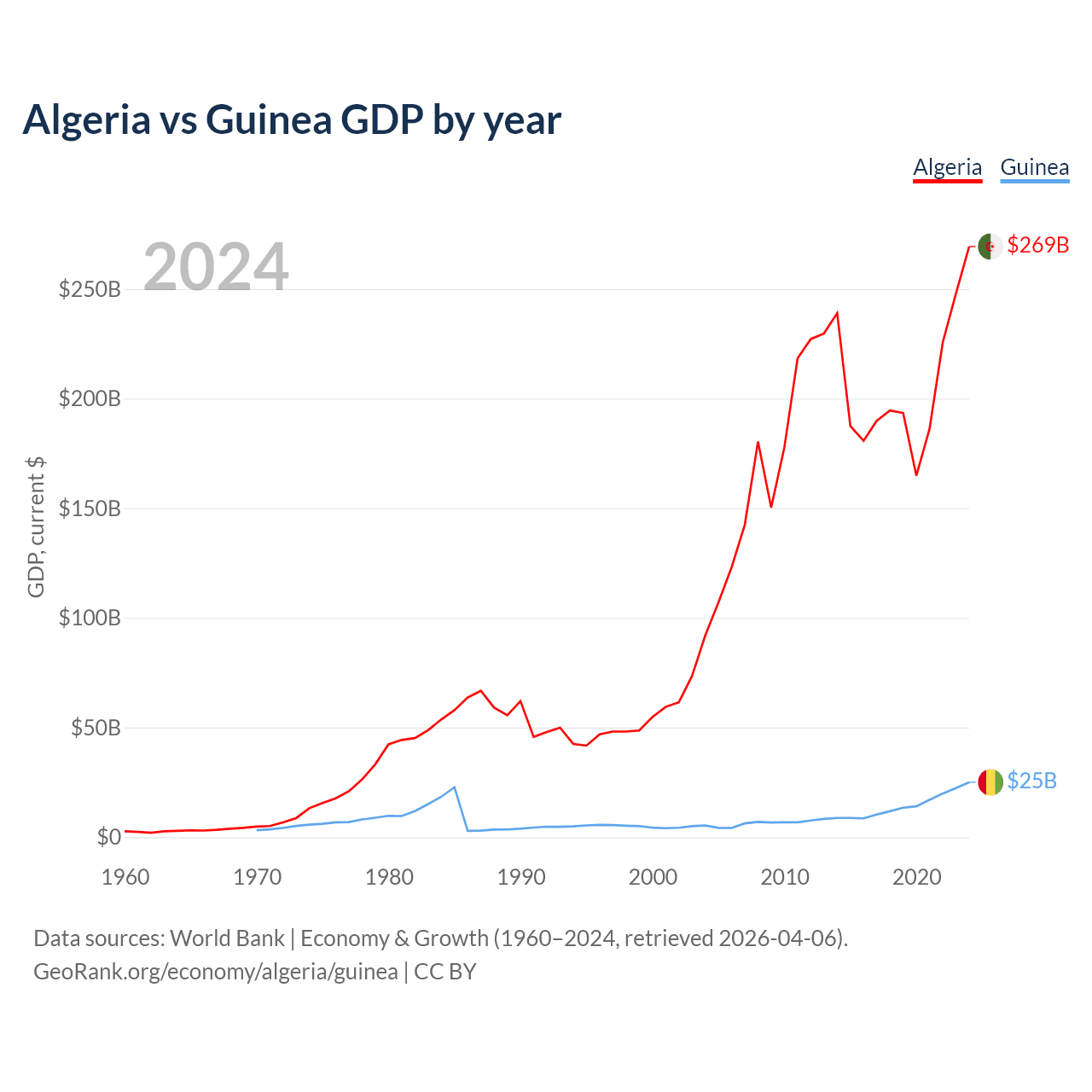 Algeria has a GDP of $269B compared to $25B for Guinea, ranking 51/197 and 118/197 by economy size, respectively.