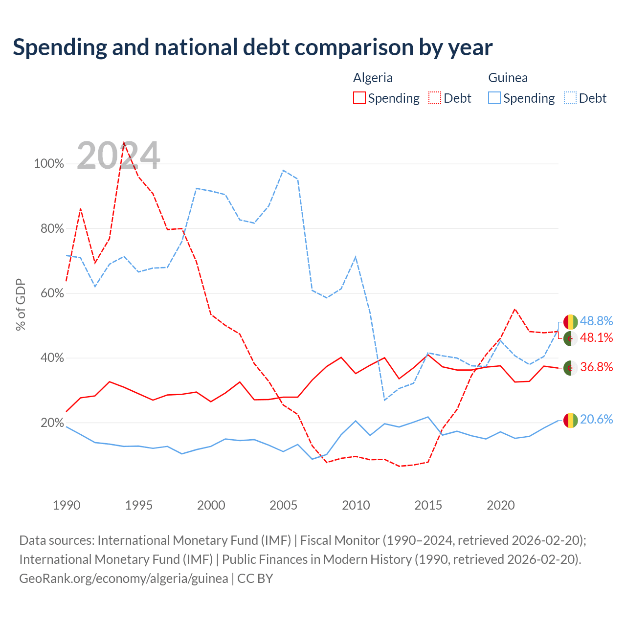 Algeria has $129B in government debt (48.1% of GDP), compared to $12.2B (48.8% of GDP) in Guinea.