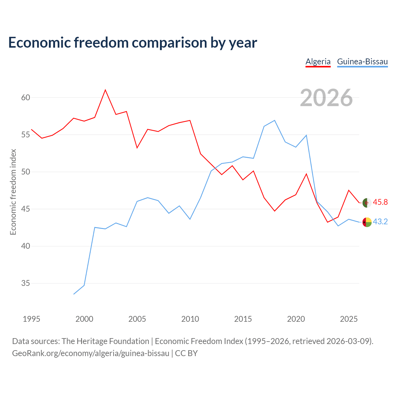 The Economic Freedom Index for Algeria is 45.8, ranking 179/197, compared to 43.2 for Guinea-Bissau, ranking 181/197. The chart above displays a comparison of annual changes in economic freedom indexes.